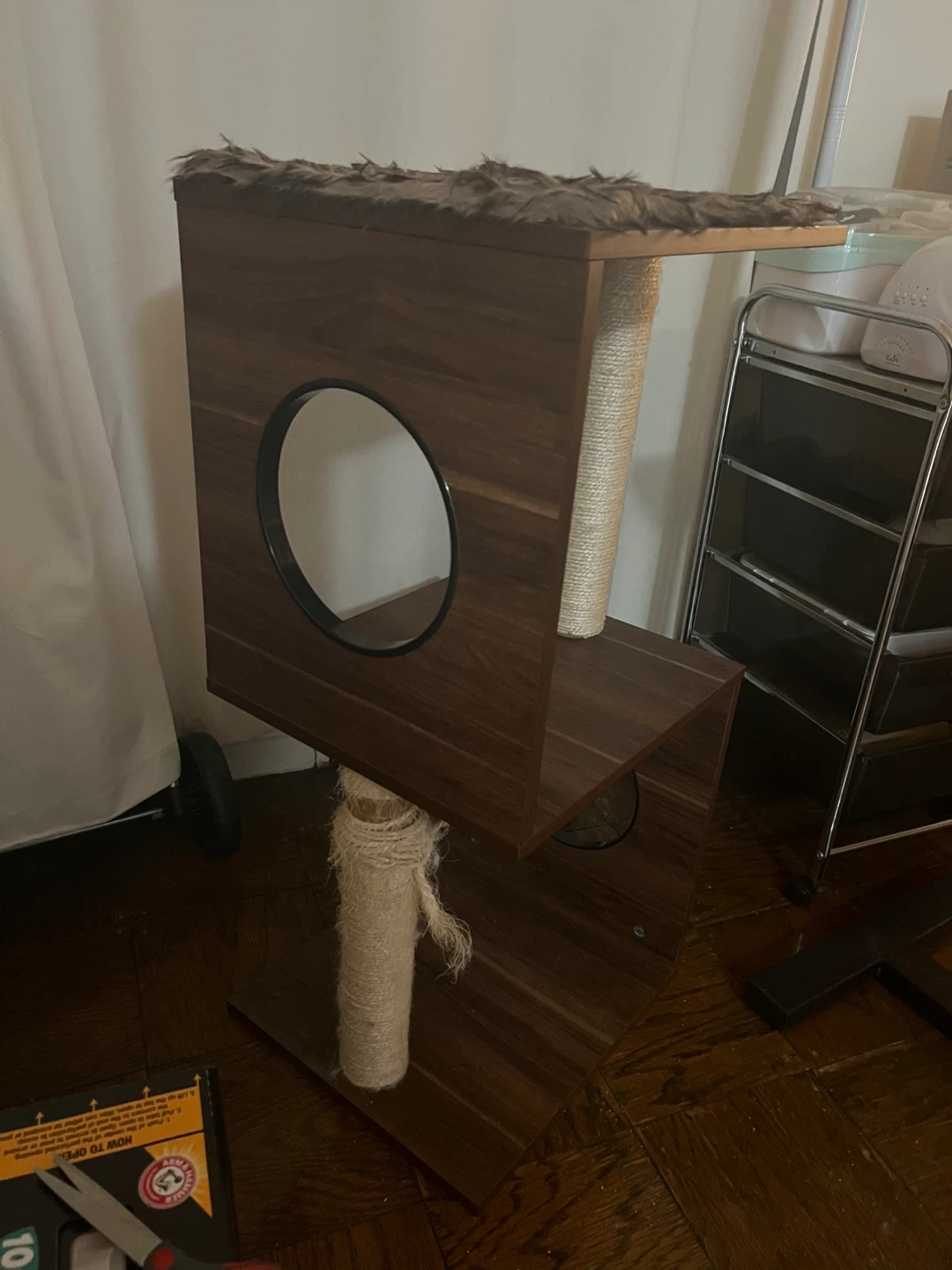 This is a cat tree that features a scratching post and a cozy place for your cat to relax! It's a brown color and has a modern design that will fit in with your home decor