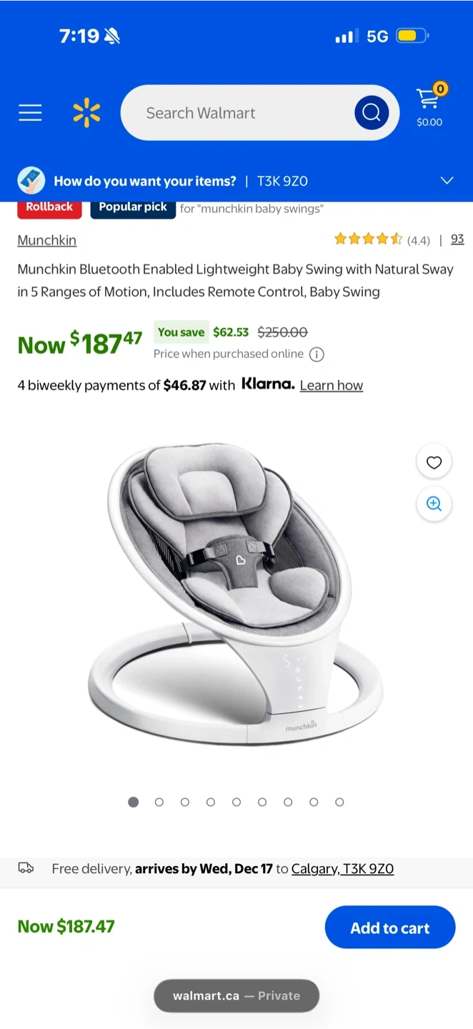 Selling a Munchkin Bluetooth Enabled Lightweight Baby Swing with Natural Sway. It has 5 ranges of motion and includes a remote control. Originally priced at $187.47.