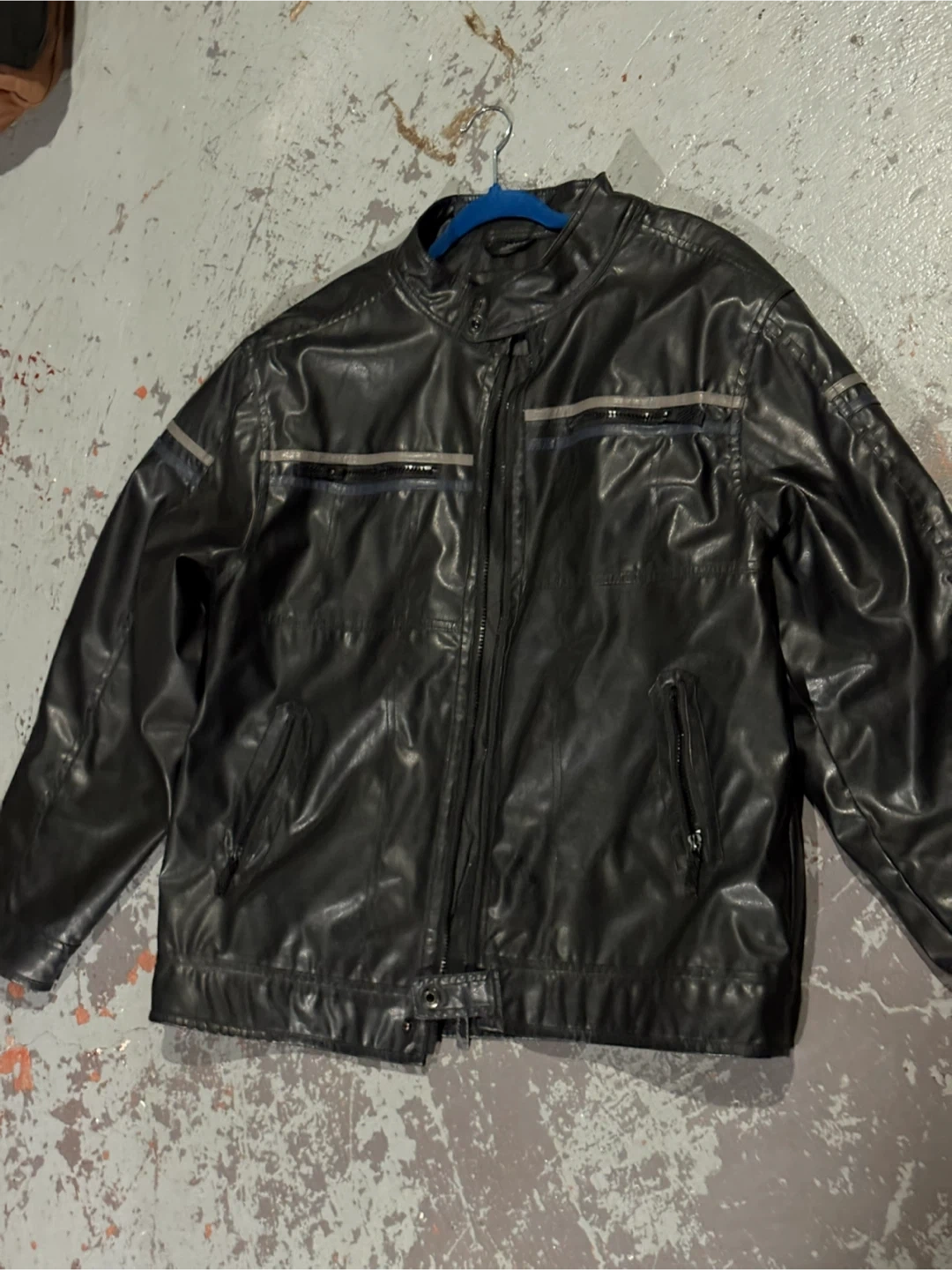 Here's a black leather jacket that could be a great fit for someone! It's in good condition and ready to wear. It features a zip-up front and some stylish detailing on the shoulders