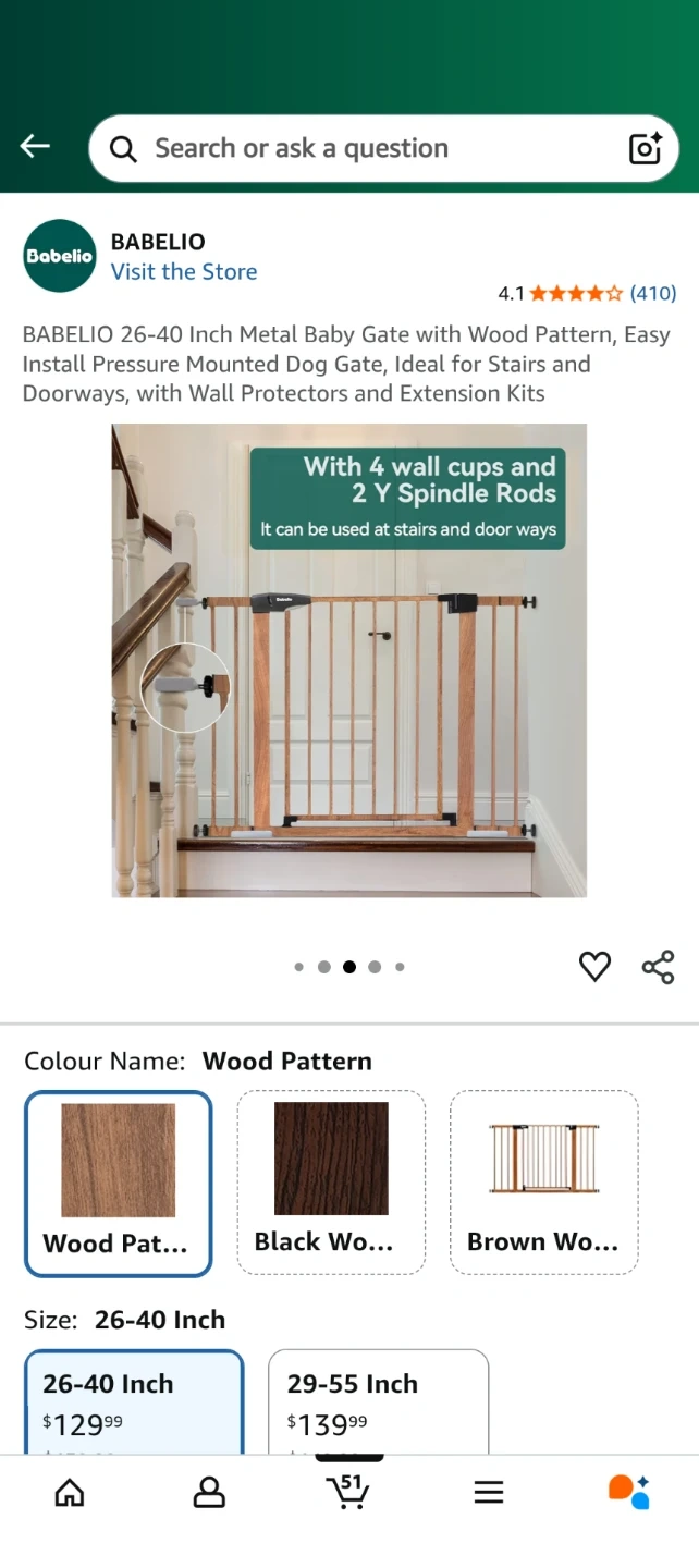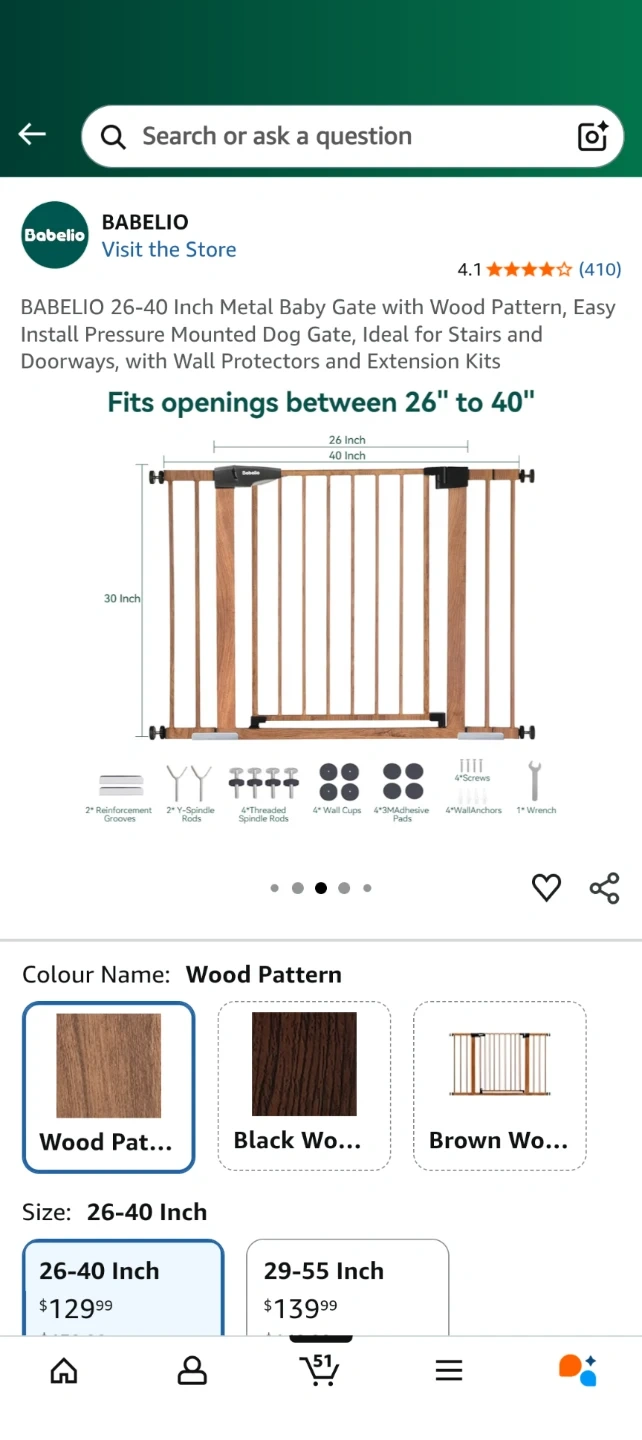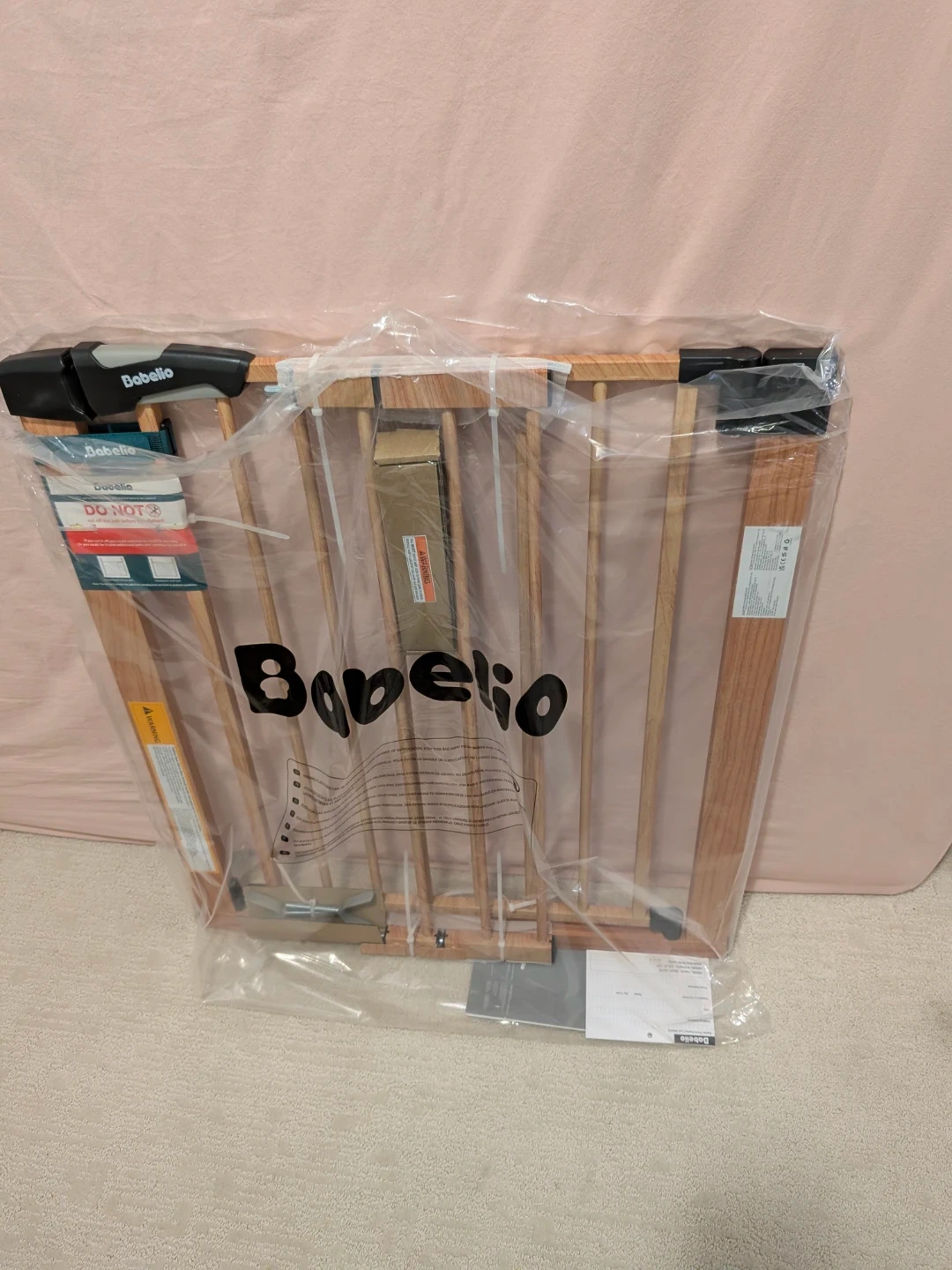 Selling a Babelio baby gate with a wood pattern. It's a metal gate that fits openings between 26 and 40 inches. It can be used at the top or bottom of stairs, and in doorways. It comes with wall protectors and extension kits, as well as 4 wall cups and 2 Y spindle rods.