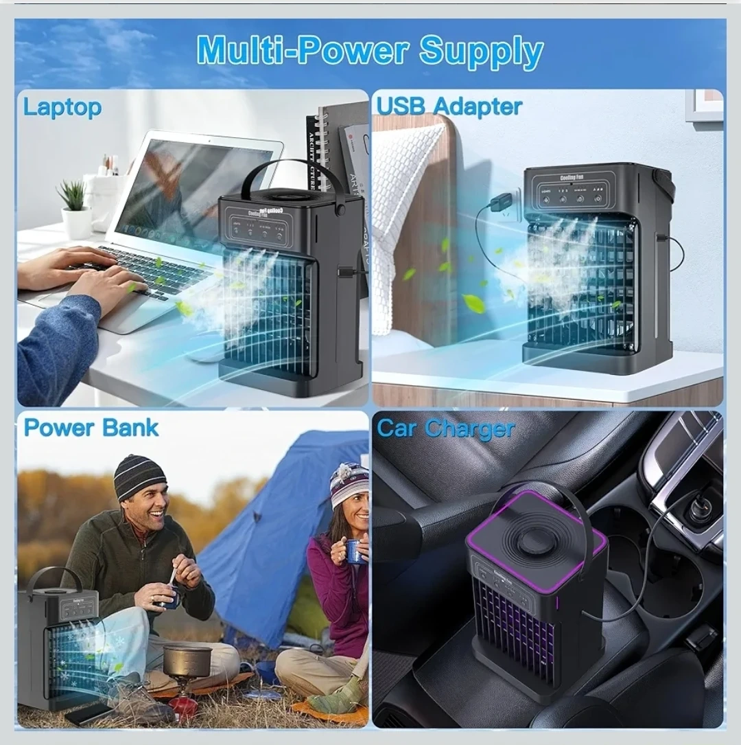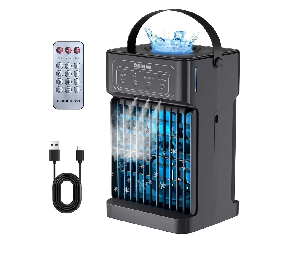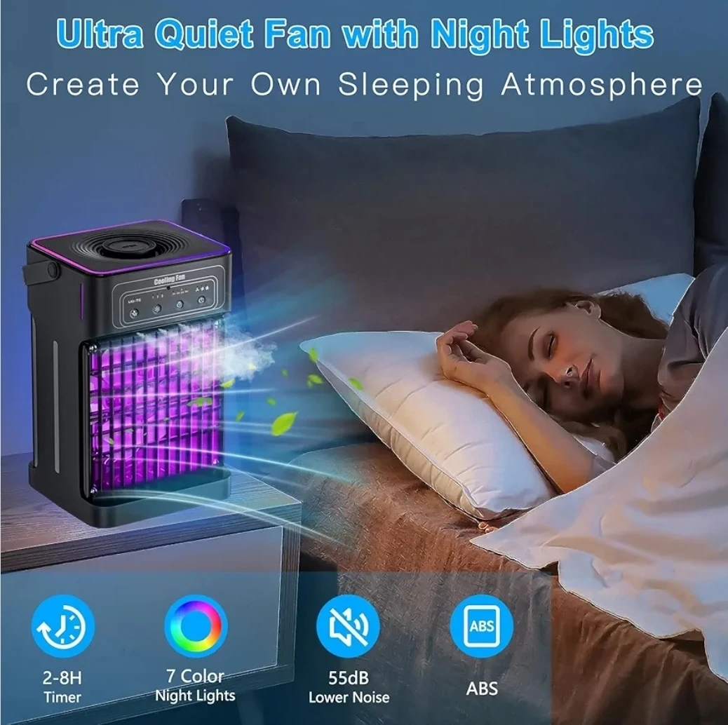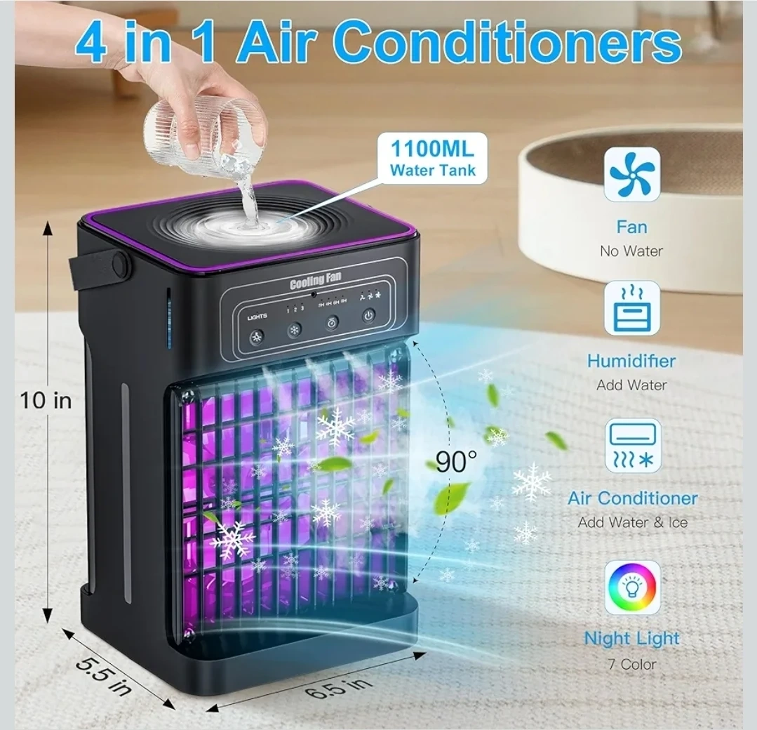 Stay cool anywhere with this compact 4-in-1 portable air conditioner featuring double fan blades, cool mist, night light, and timer — perfect for bedrooms, desks, camping, or office use.