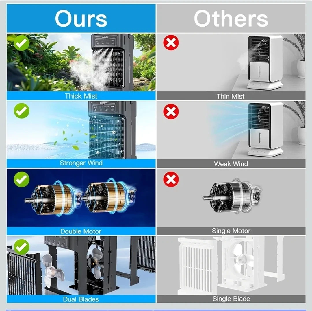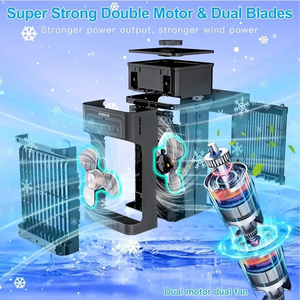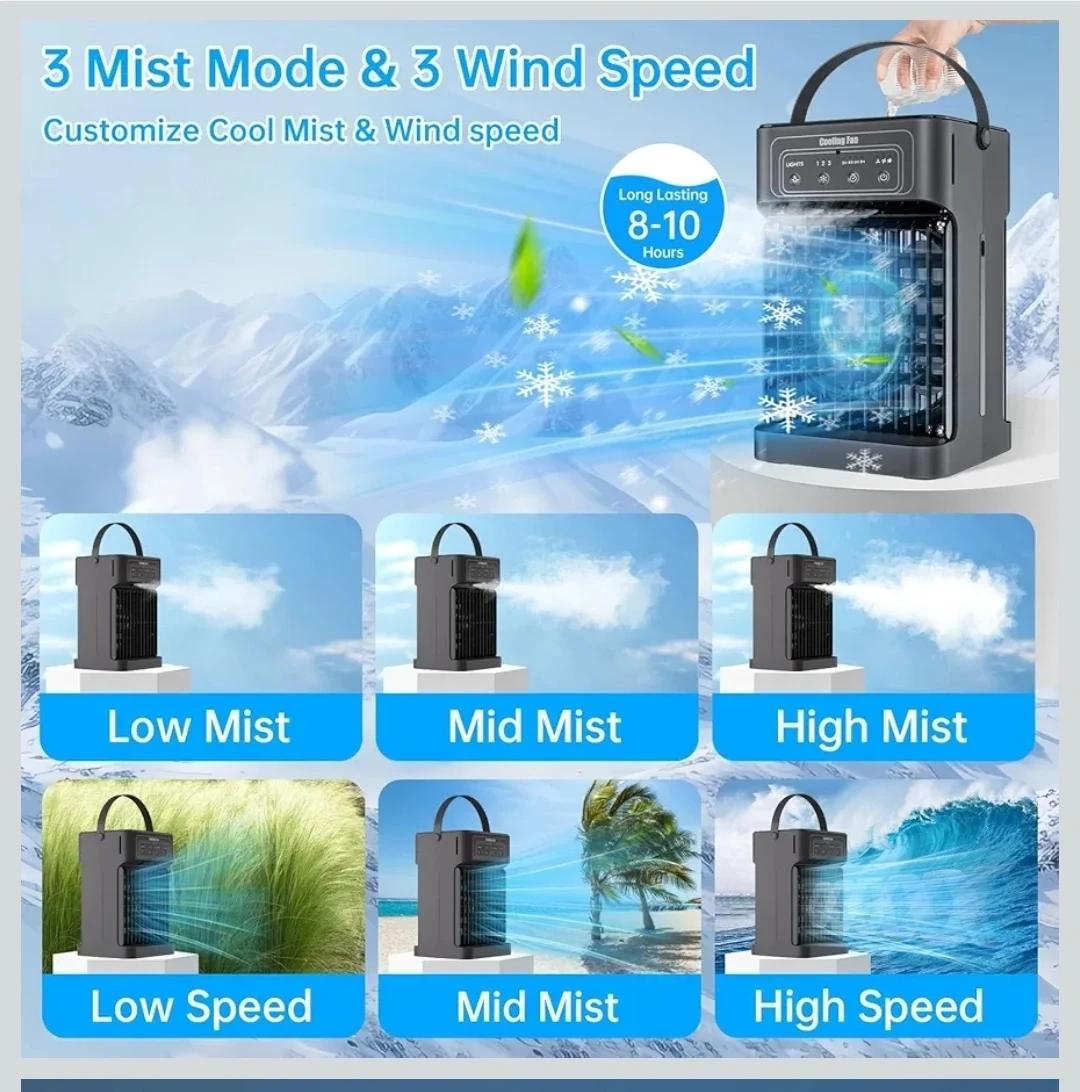 Stay cool anywhere with this compact 4-in-1 portable air conditioner featuring double fan blades, cool mist, night light, and timer — perfect for bedrooms, desks, camping, or office use.