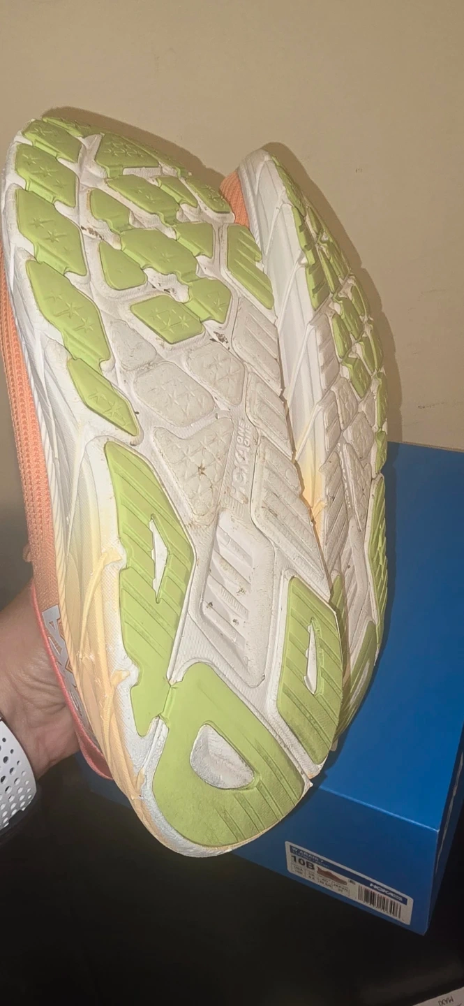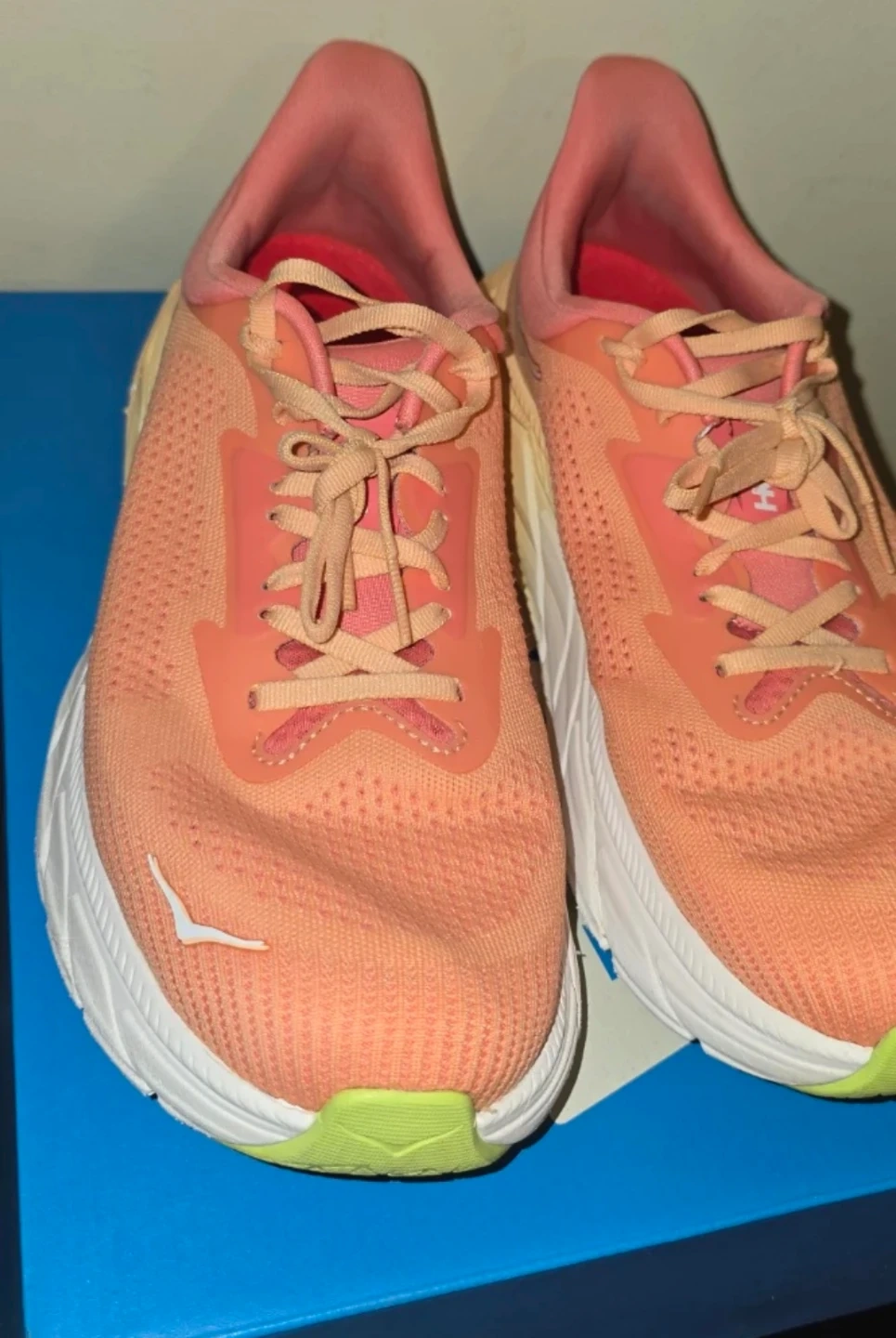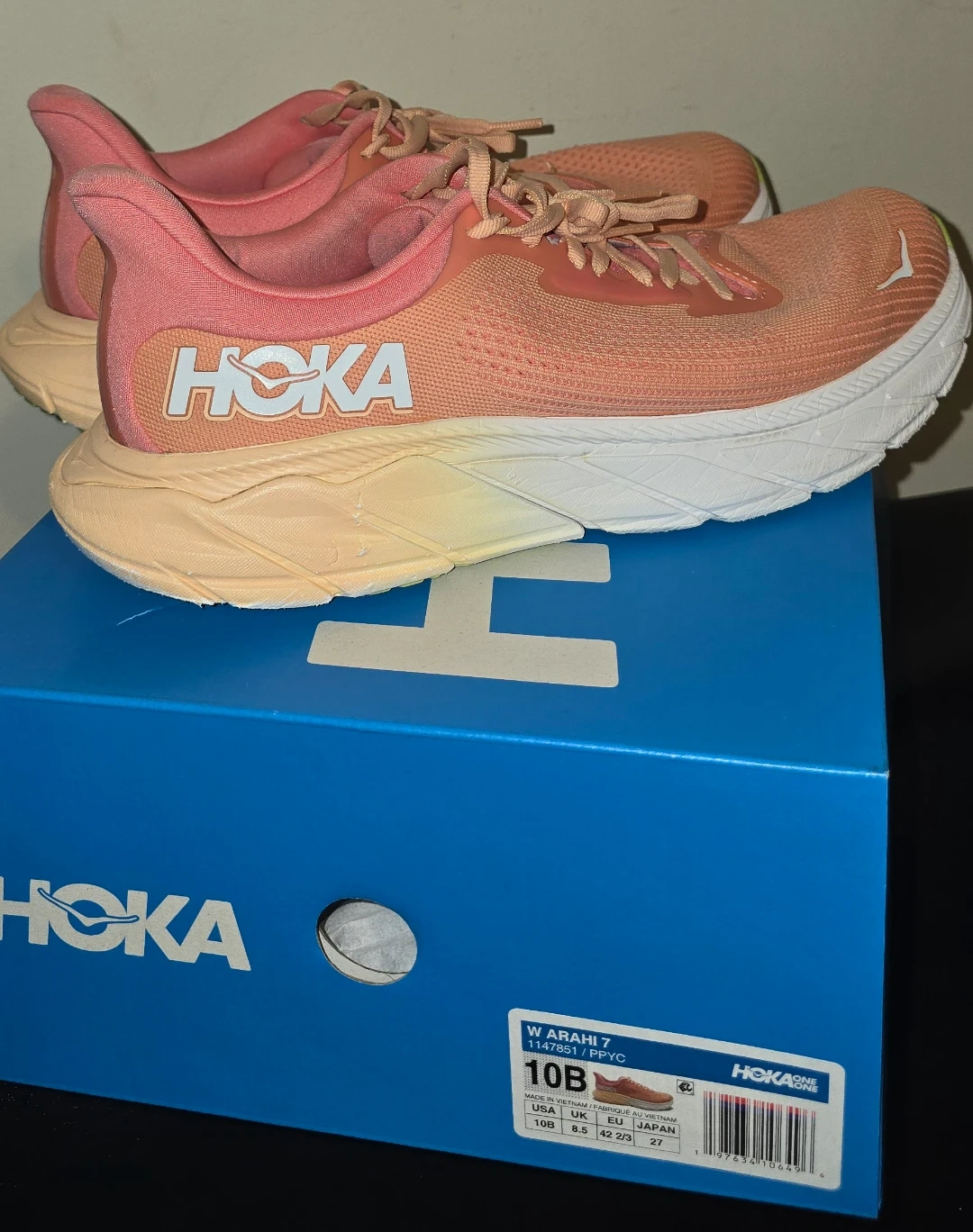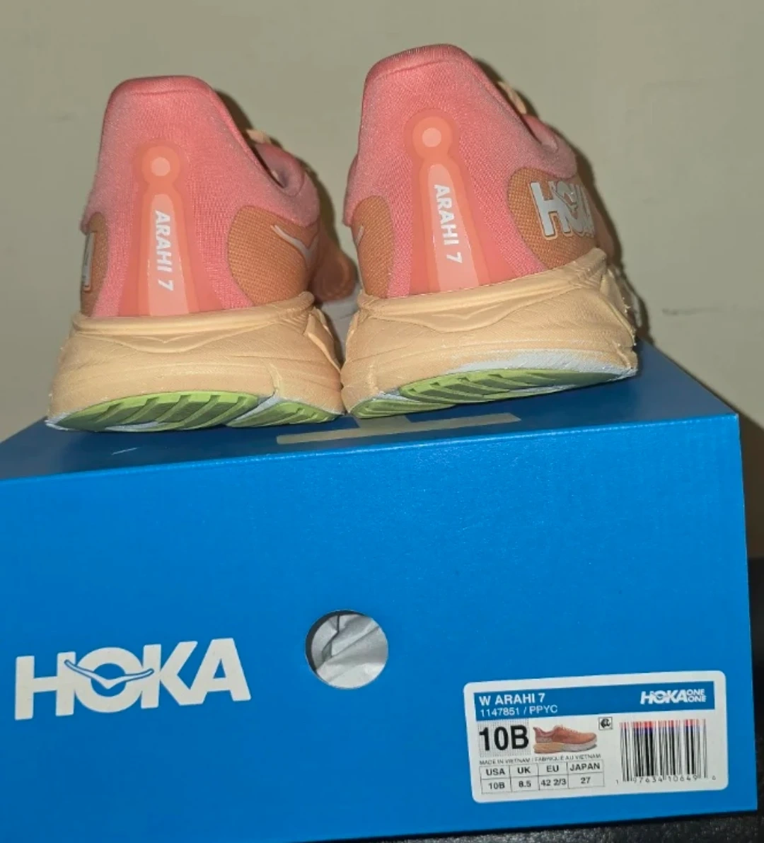 Selling a pair of Hoka Arahi 7 women's running shoes in size 10B. These shoes are in good condition and come with the original box. They feature a peach color and are designed for running and everyday wear. The box indicates the model number is 1147851/PPYC.
