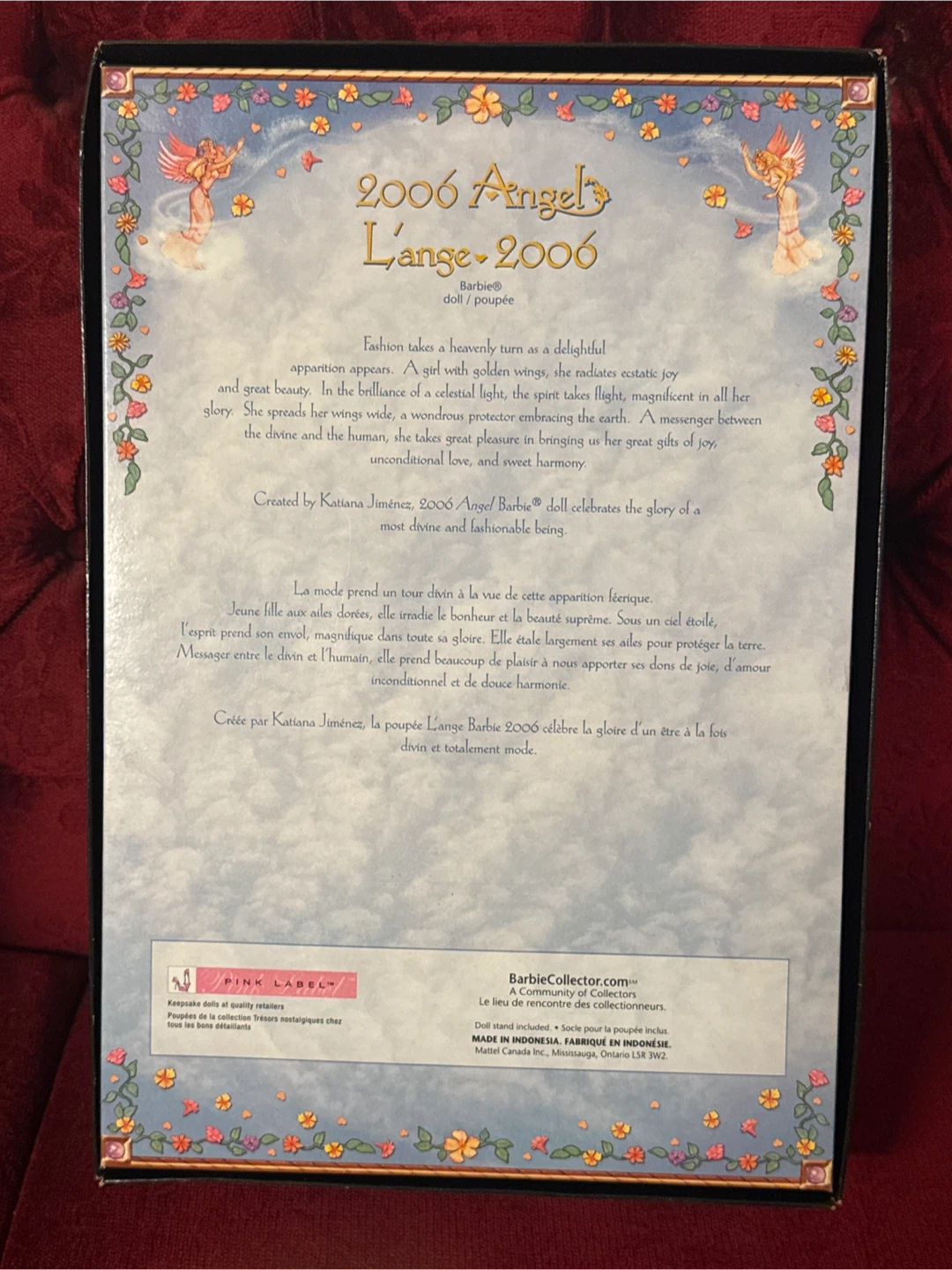 Selling a Barbie Collector Pink Label doll, the 2006 Angel's L'ange Barbie. She's still in her original box and is in excellent condition. This doll celebrates the glory of a most divine and fashionable being. Doll stand included