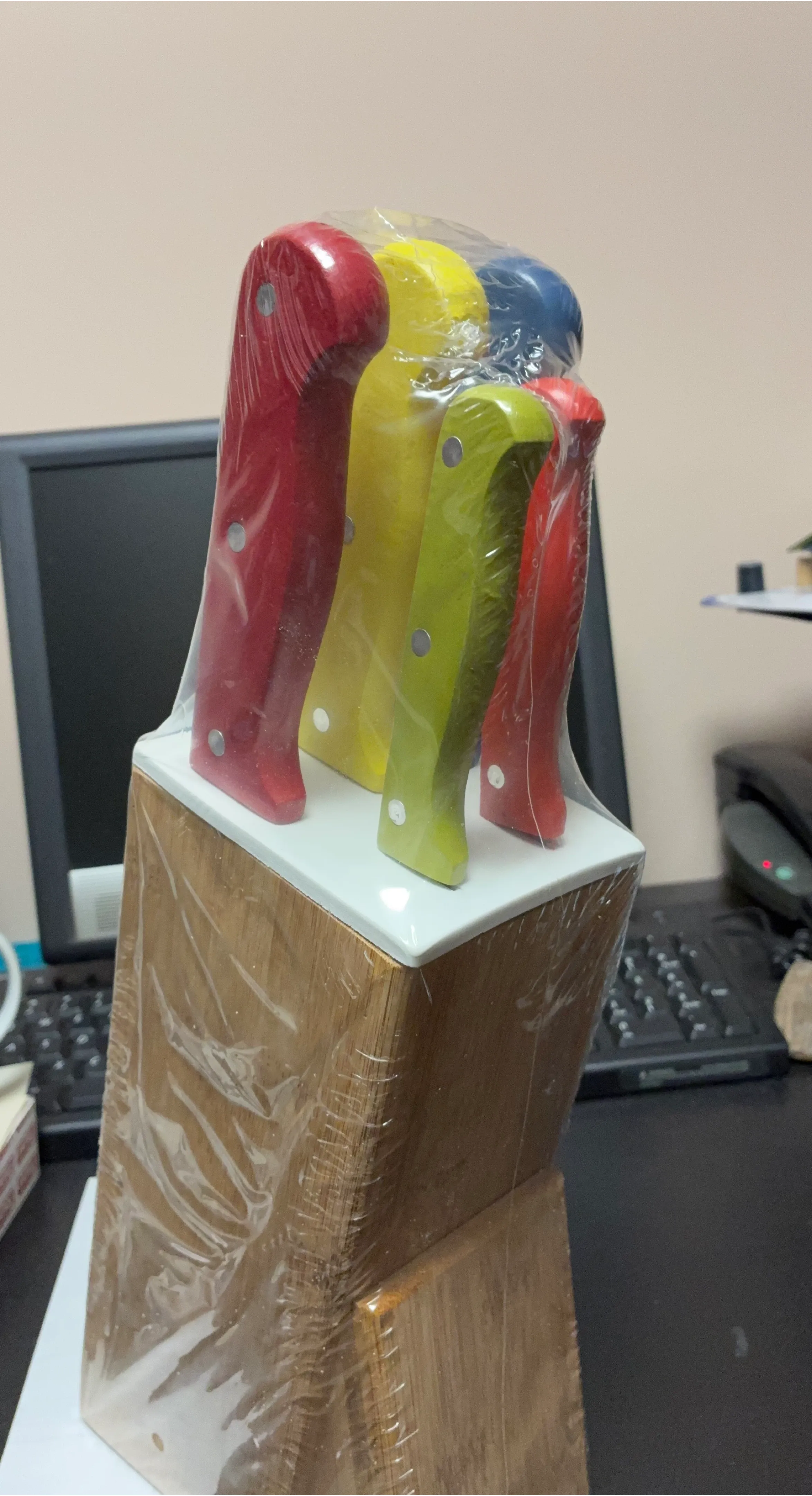 Selling a brand new knife set still in its original packaging! The set includes knives with colourful handles (red, yellow, green, and blue) and a wooden block for storage. A great addition to any kitchen!