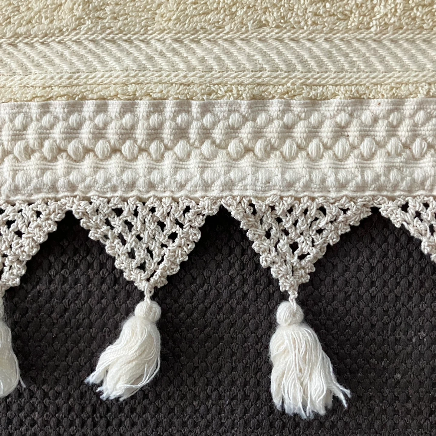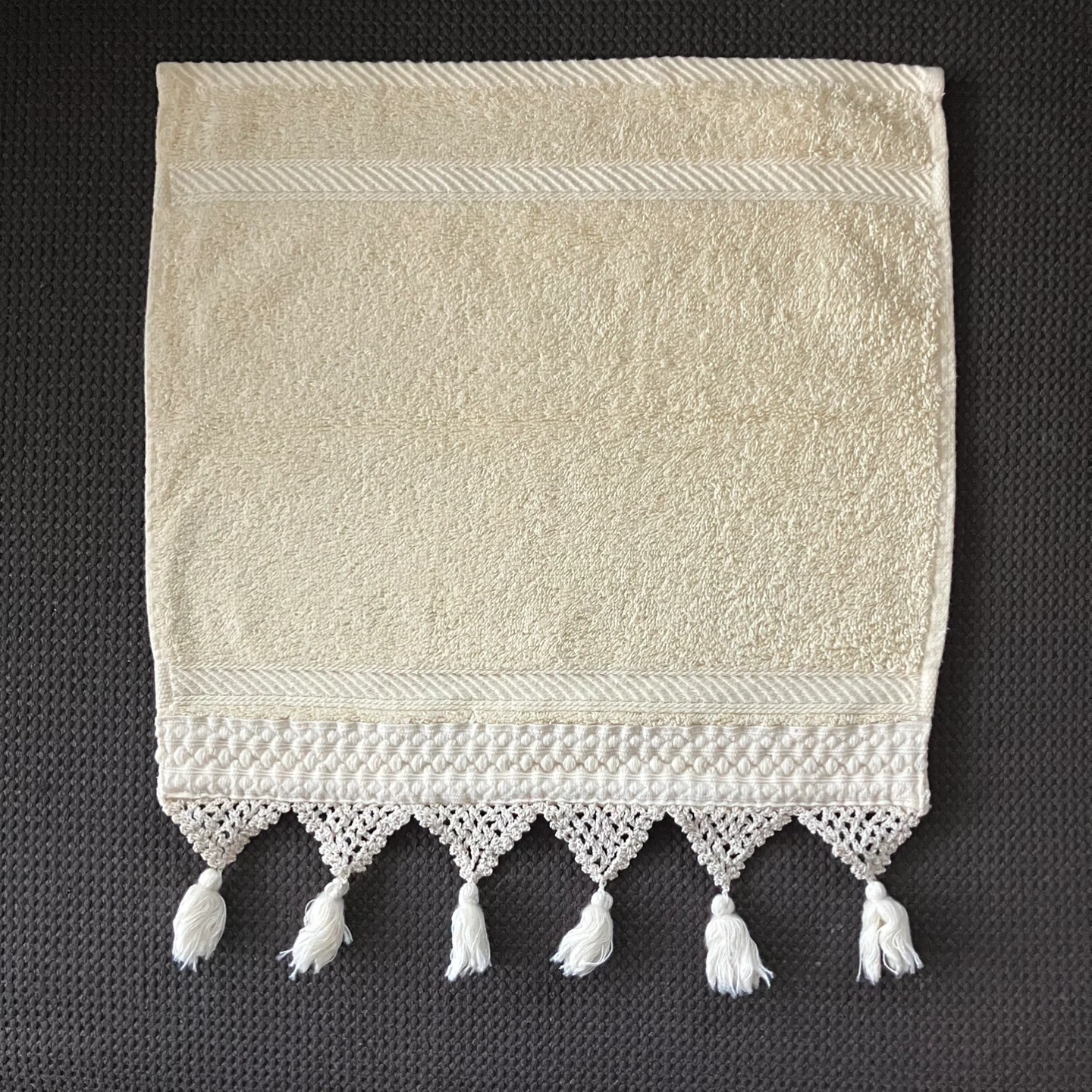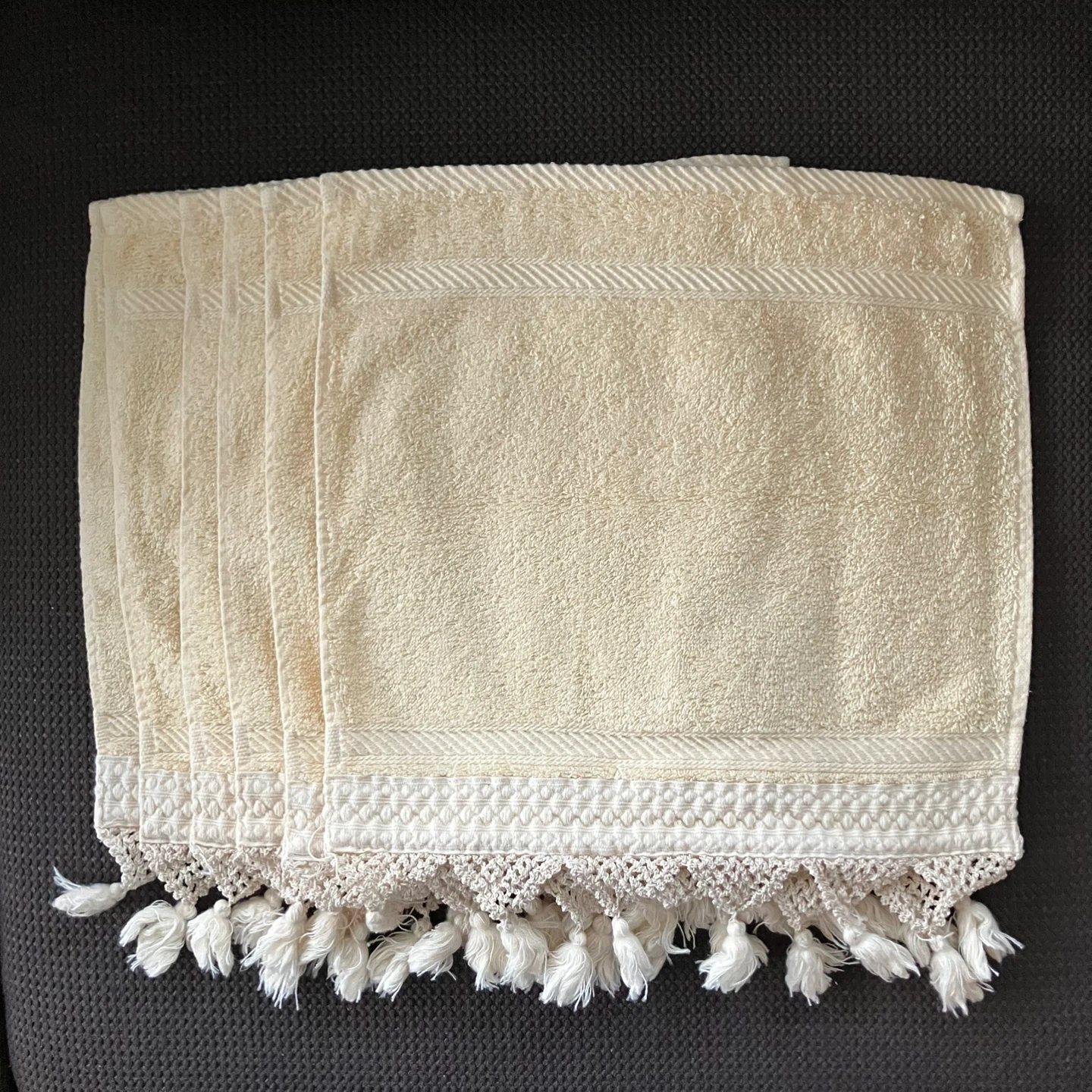 Brand new, beautiful hand towels, set of 6. They're a lovely cream colour and feature a delicate tassel trim. Perfect for adding a touch of elegance to your bathroom!