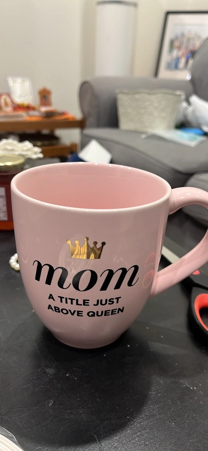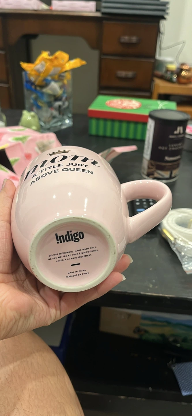 A cute pink Indigo mug that says 'Mom - A title just above queen' It's perfect for a special mom in your life! It's in great condition and ready for a new home!