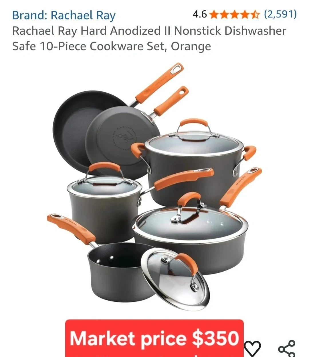 Selling a Rachael Ray Hard Anodized II Nonstick 10-Piece Cookware Set in orange. This set is dishwasher safe. I bought this for $350