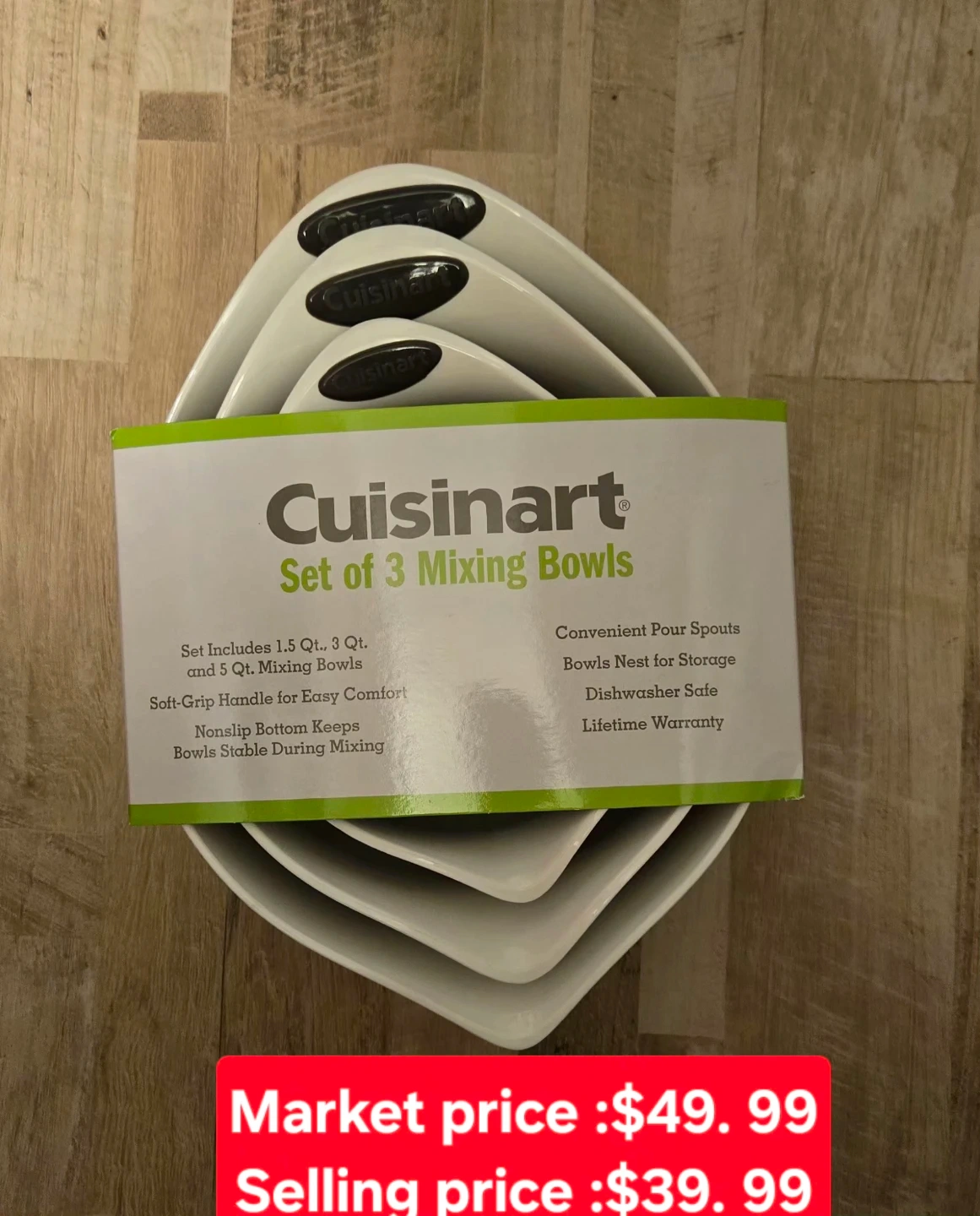 I have a brand new Cuisinart set of 3 mixing bowls for sale! The set includes 1.5 Qt., 3 Qt. and 5 Qt. mixing bowls. The bowls have convenient pour spouts and nest for storage. They're also dishwasher safe and have a soft-grip handle for easy comfort! Market price is $49.99