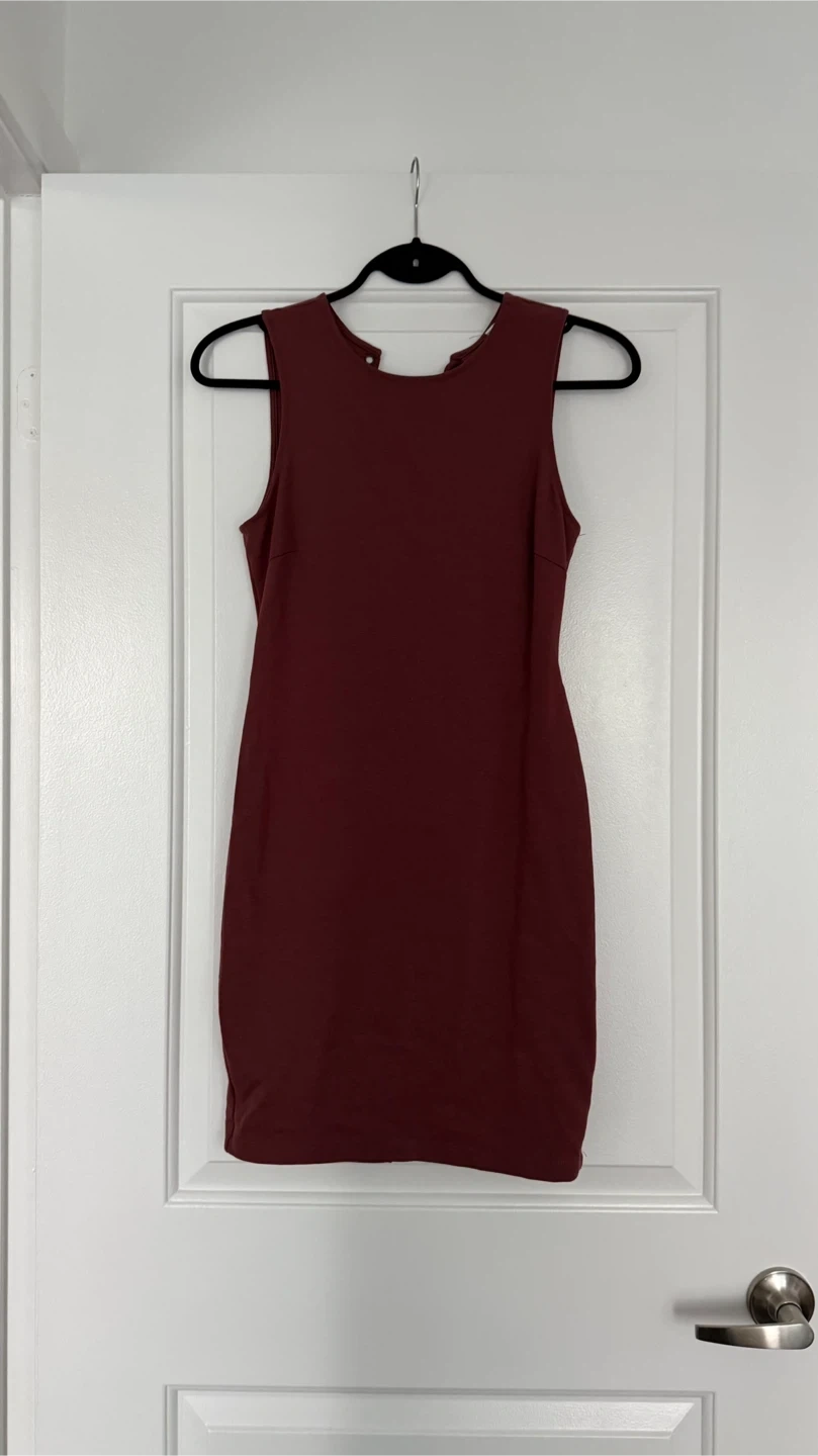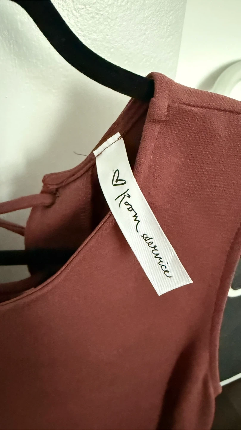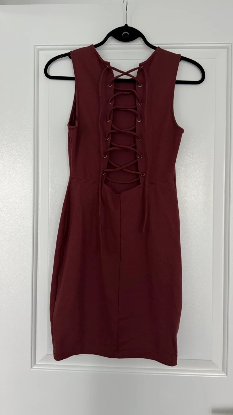 Selling a cute burgundy dress from Room Service! It features a stylish lace-up back detail. Perfect for a night out or a special occasion.