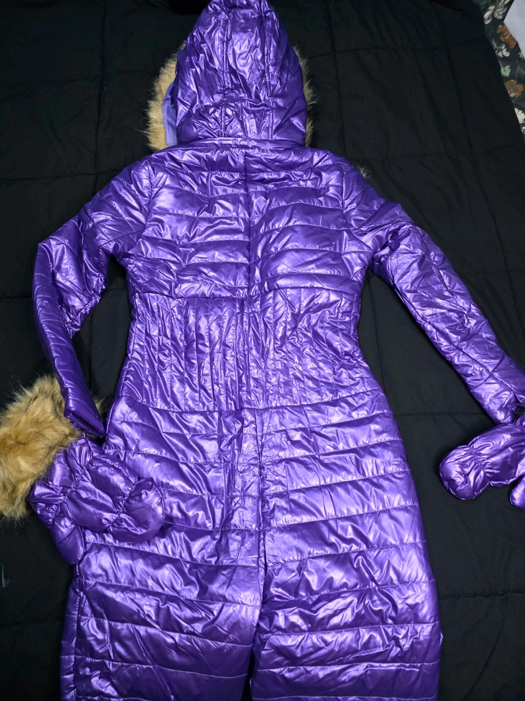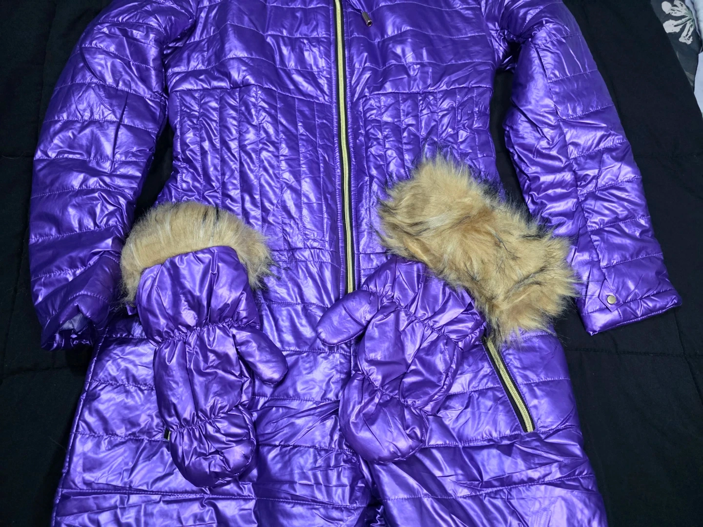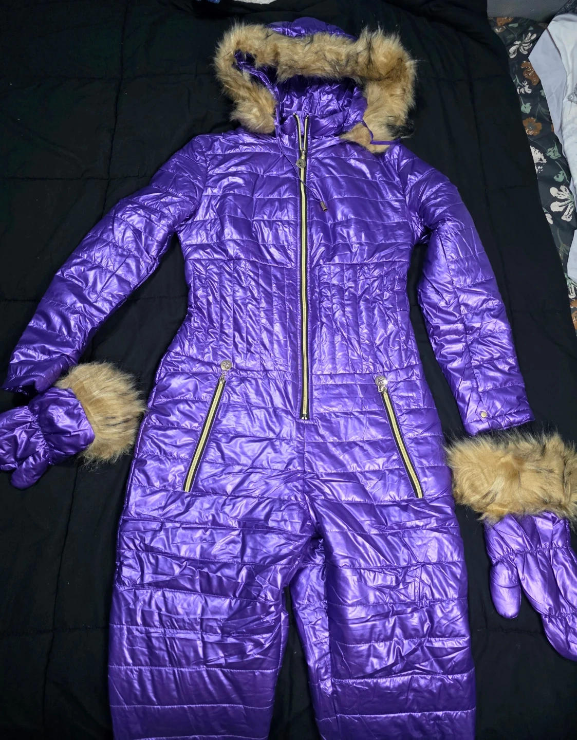 Get ready for winter with this stylish purple snowsuit! It features a fur-trimmed hood and matching gloves to keep you warm and cozy. The snowsuit is in new condition no tags..