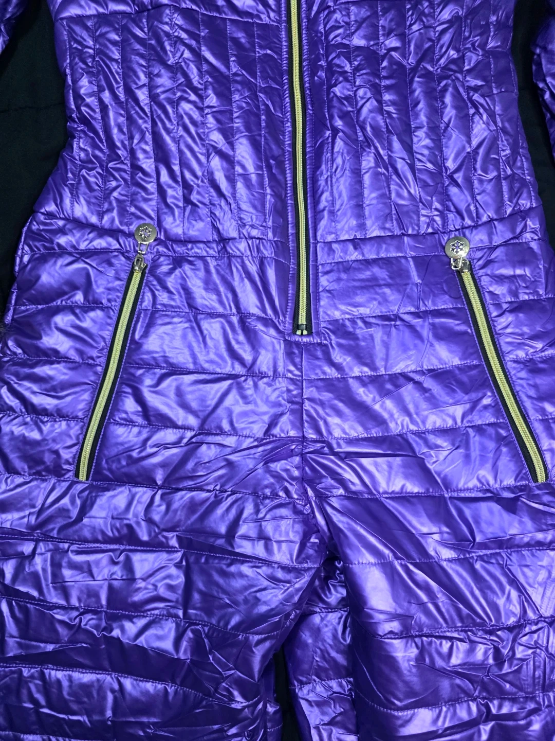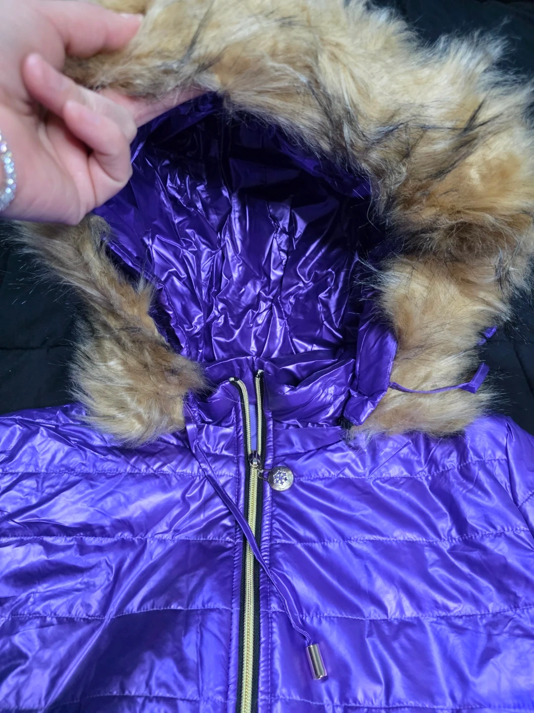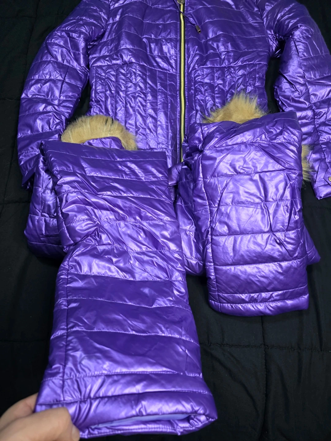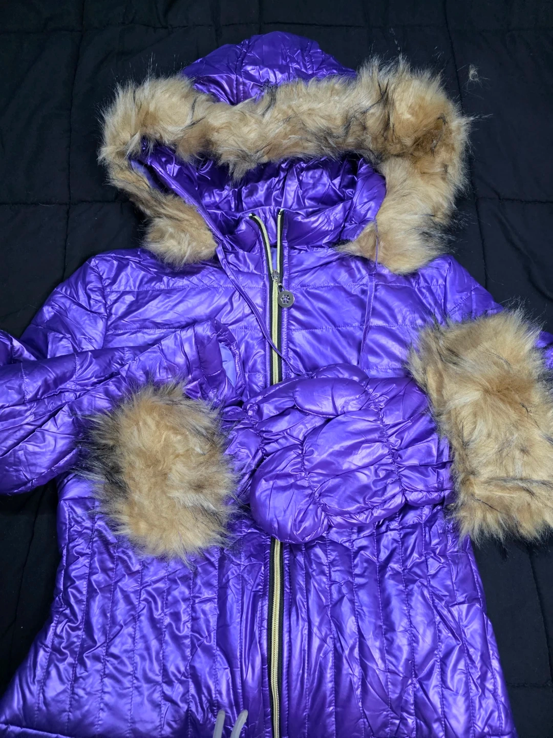 Get ready for winter with this stylish purple snowsuit! It features a fur-trimmed hood and matching gloves to keep you warm and cozy. The snowsuit is in new condition no tags..