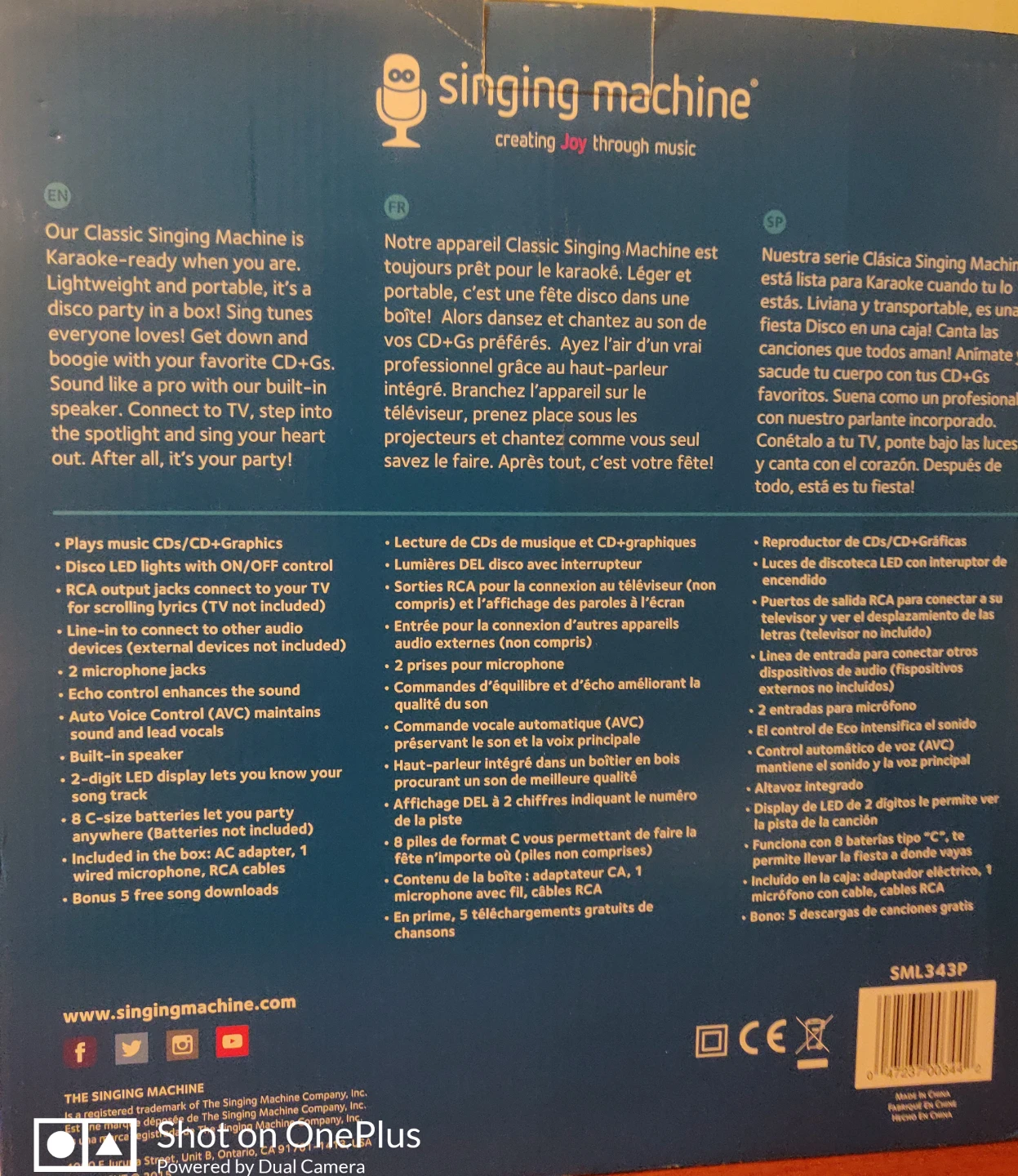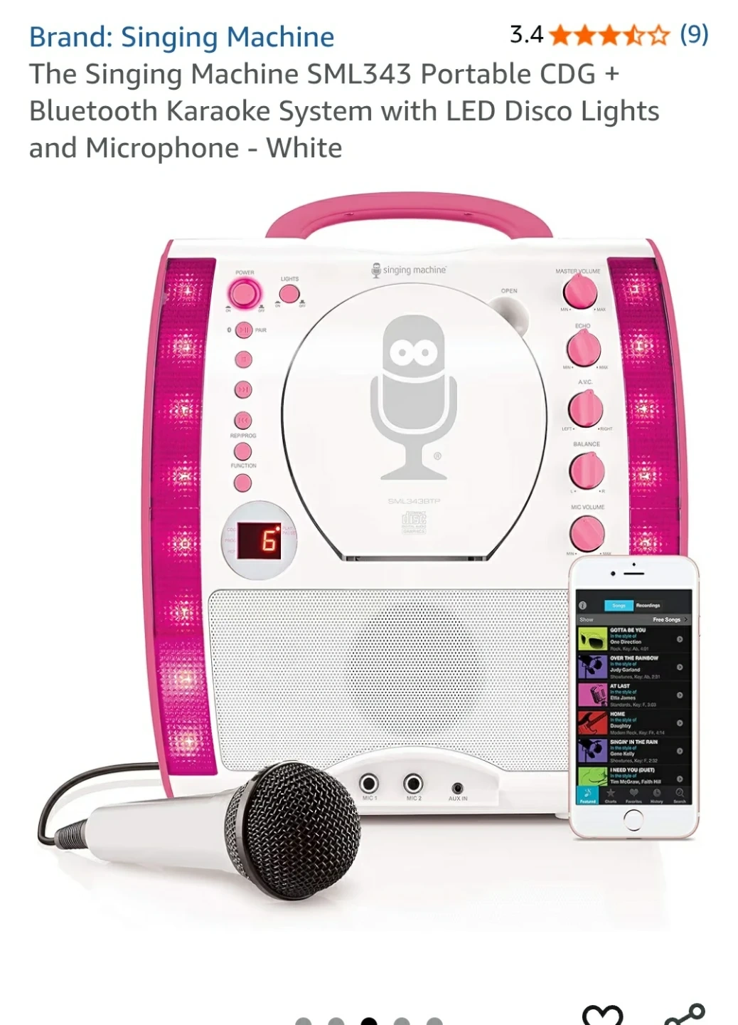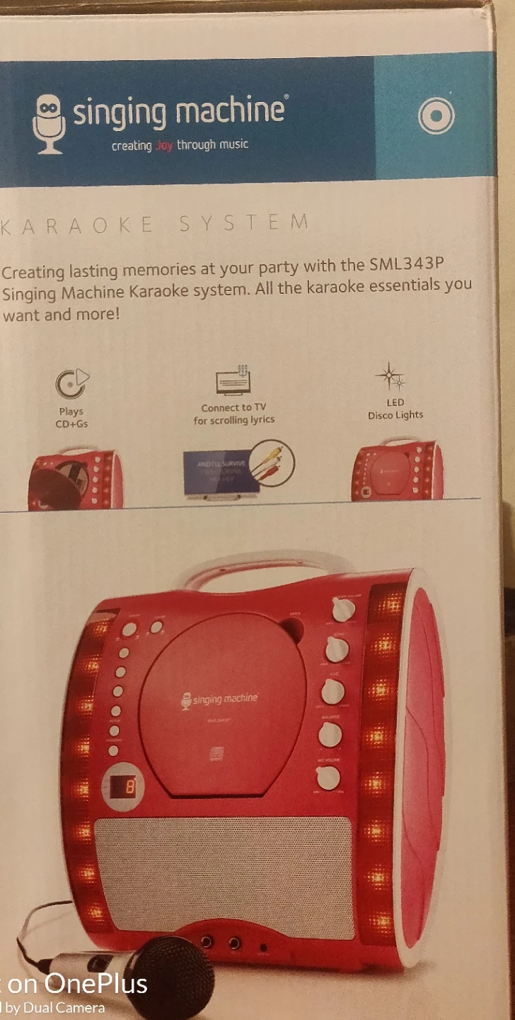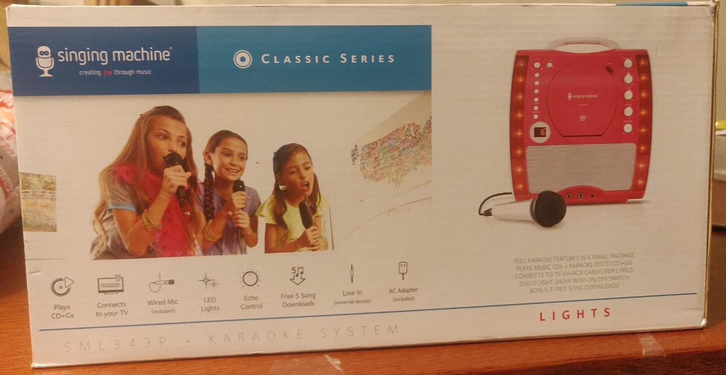 Karaoke is here to stay. The Singing Machine Classic series blows the roof off your mother's karaoke, pumping your favorite music out of a lightweight package. The SML343 features a front loading CD Player that plays music CDs and CD+Graphics. The disco light feature kicks up your performance with extra glam. Line-in lets you connect to other audio devices (sold separately). RCA output jacks connect to your TV to scroll the lyrics, and the two microphone jacks allow you to sing a duet without sharing a microphone (one microphone included). The built-in speaker provides powerful sound.