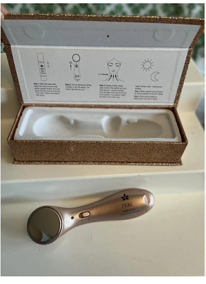 Stop wasting product! The PRAI AGEless Throat Ionic Device uses negative ionic microcurrent to push your serums deeper, stimulate collagen, and dramatically reduce lines. Get a smoother, contoured neck and jawline, guaranteed.