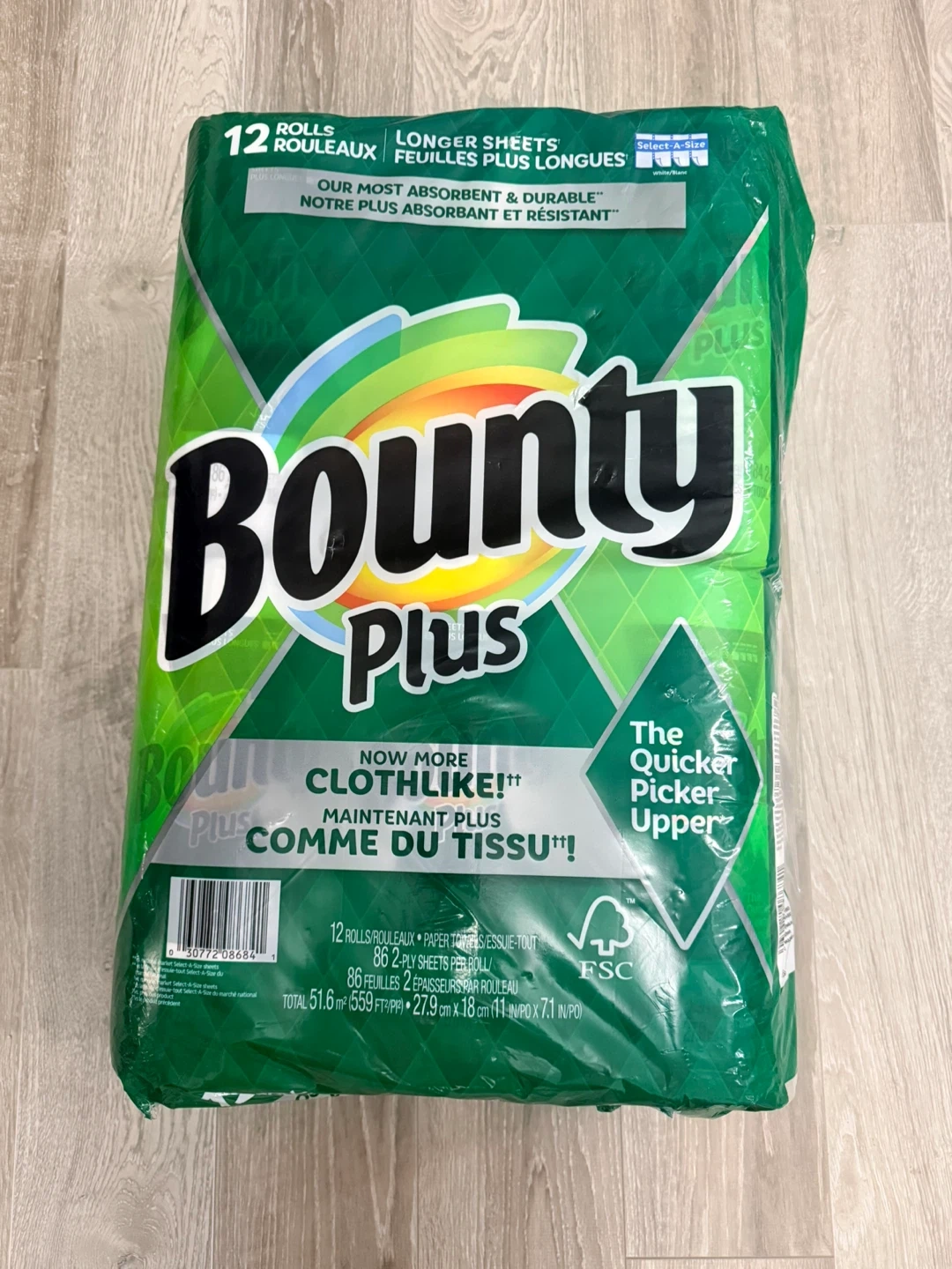 Selling a pack of Bounty Plus paper towels. This package contains 12 rolls of paper towels, each with 86 2-ply sheets. This is Costco size product.