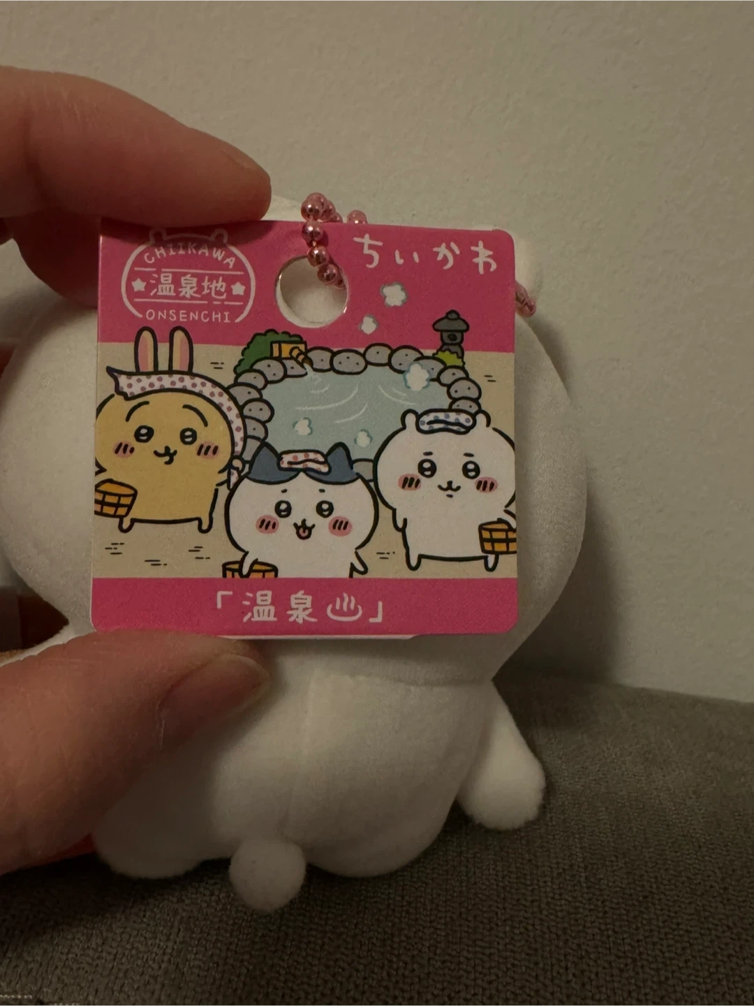 This adorable Chiikawa Onsen plushie keychain is brand new and ready to tag along on your adventures! It is from Japan and features Chiikawa in a cute onsen theme with a little bucket accessory. The tag indicates it's a limited edition item from a hot spring resort!