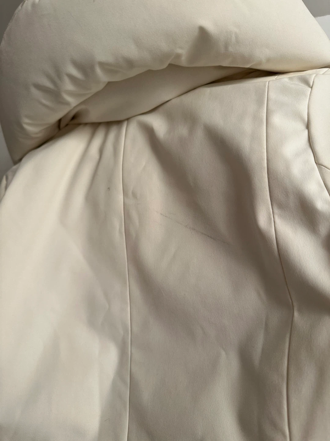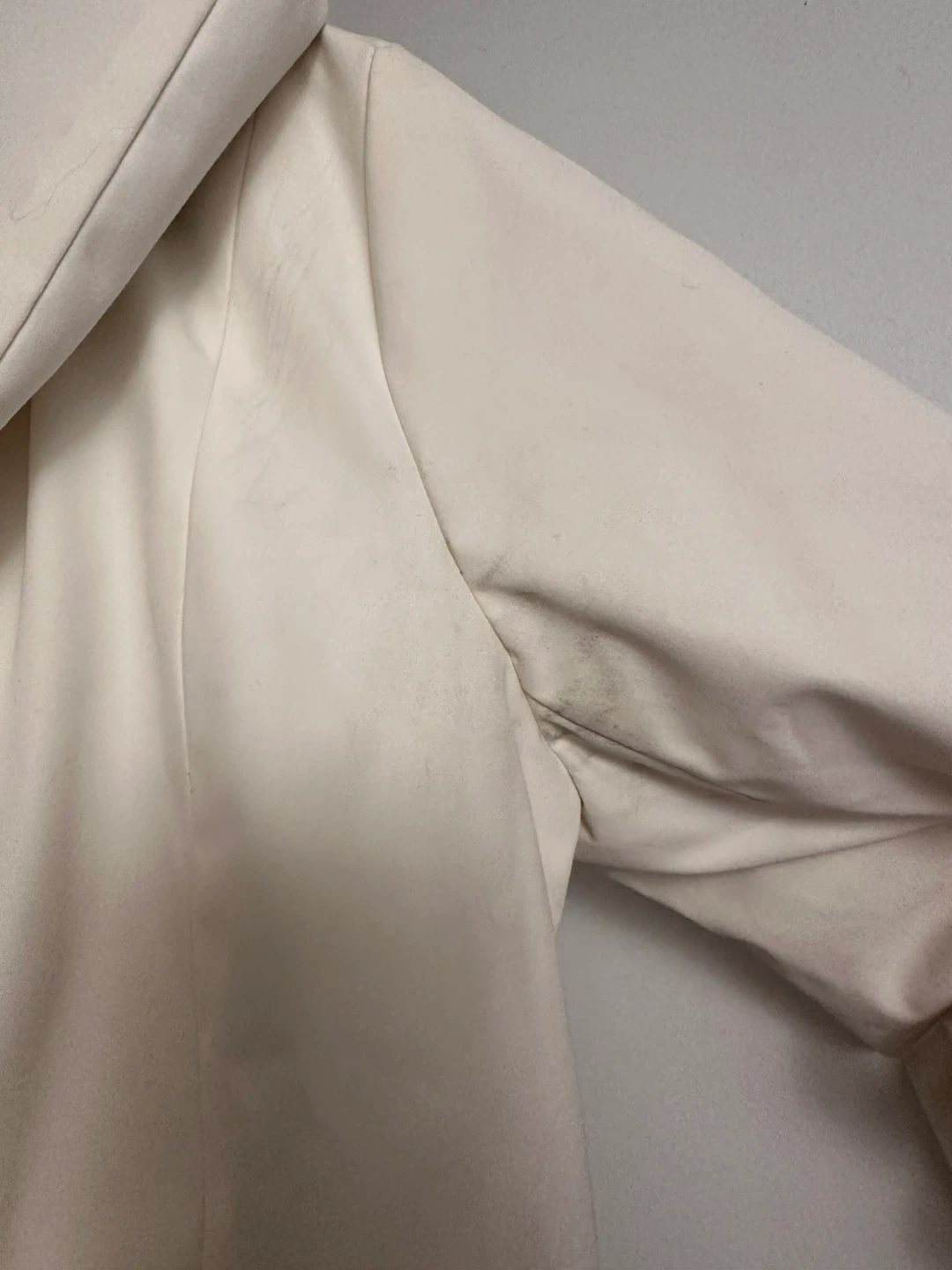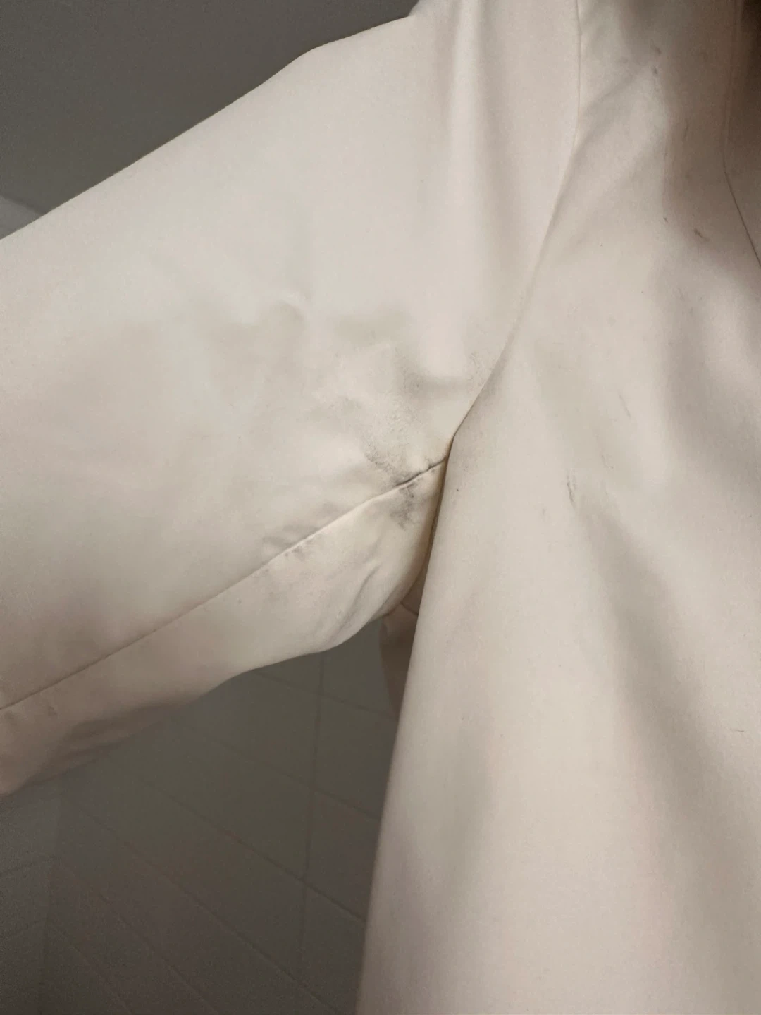 The jacket has barely been worn but there are some black stains under the arms and on the back as shown in photos