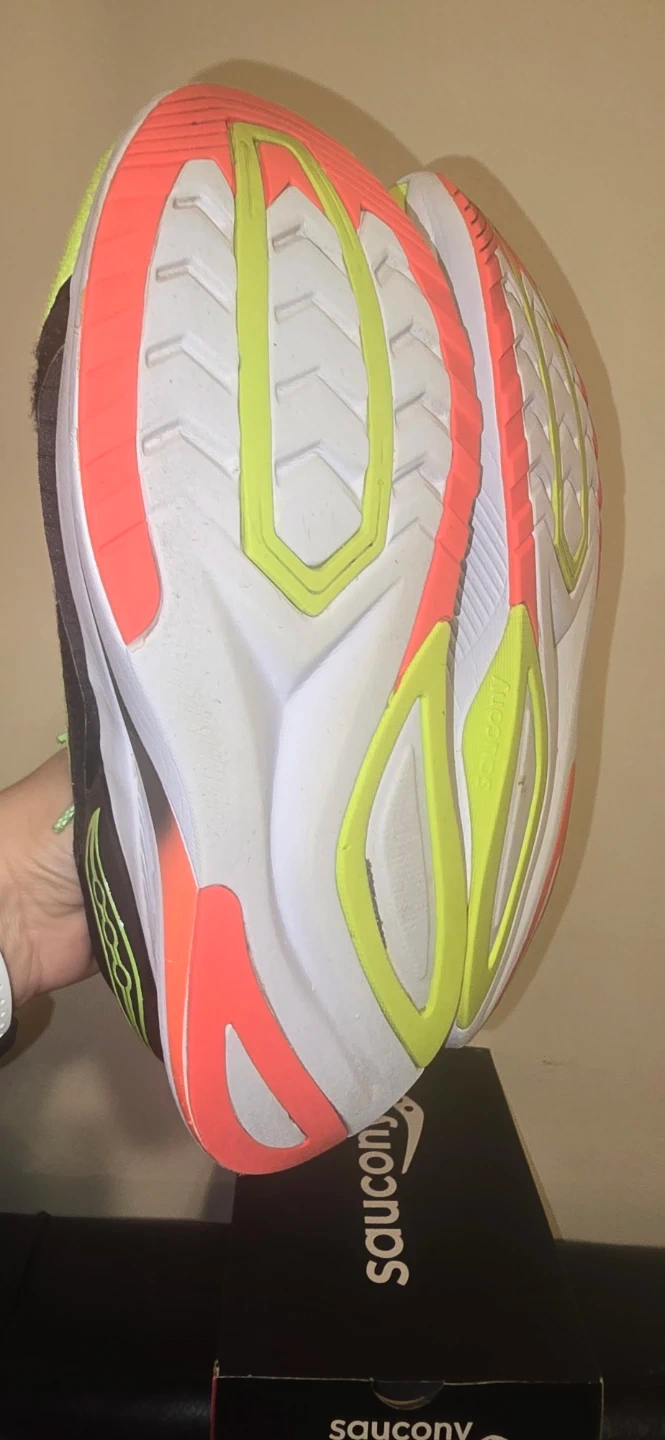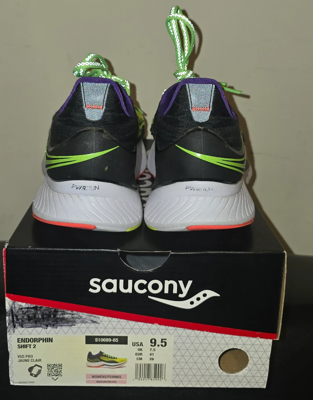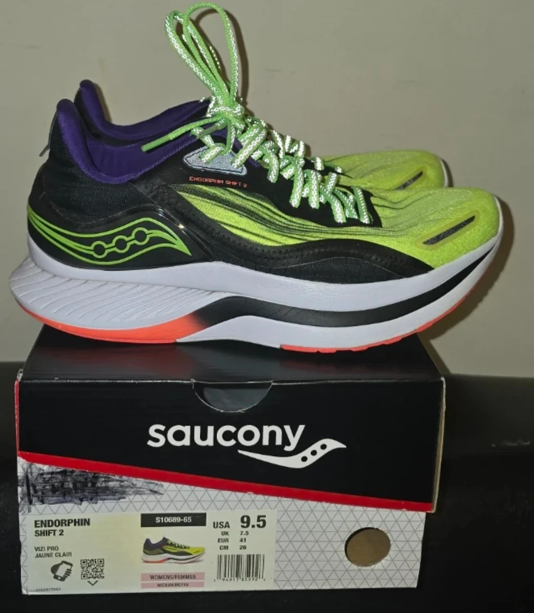 Selling a pair of Saucony Endorphin Shift 2 women's running shoes in size 9.5 US. These shoes are in great condition and come with the original box. They're a stylish mix of black, purple, and neon green, with a vibrant orange accent on the sole. Perfect for running or everyday wear!