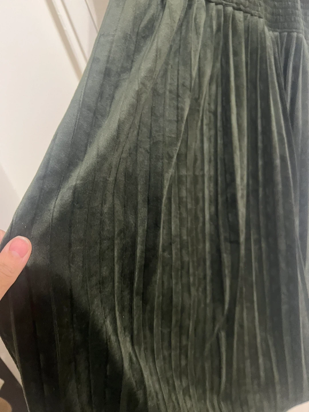 Here's a lovely olive green velvet dress! It's in great condition and ready for a new home. The material feels so soft and luxurious, perfect for dressing up or down. It has long sleeves and a tie at the back.