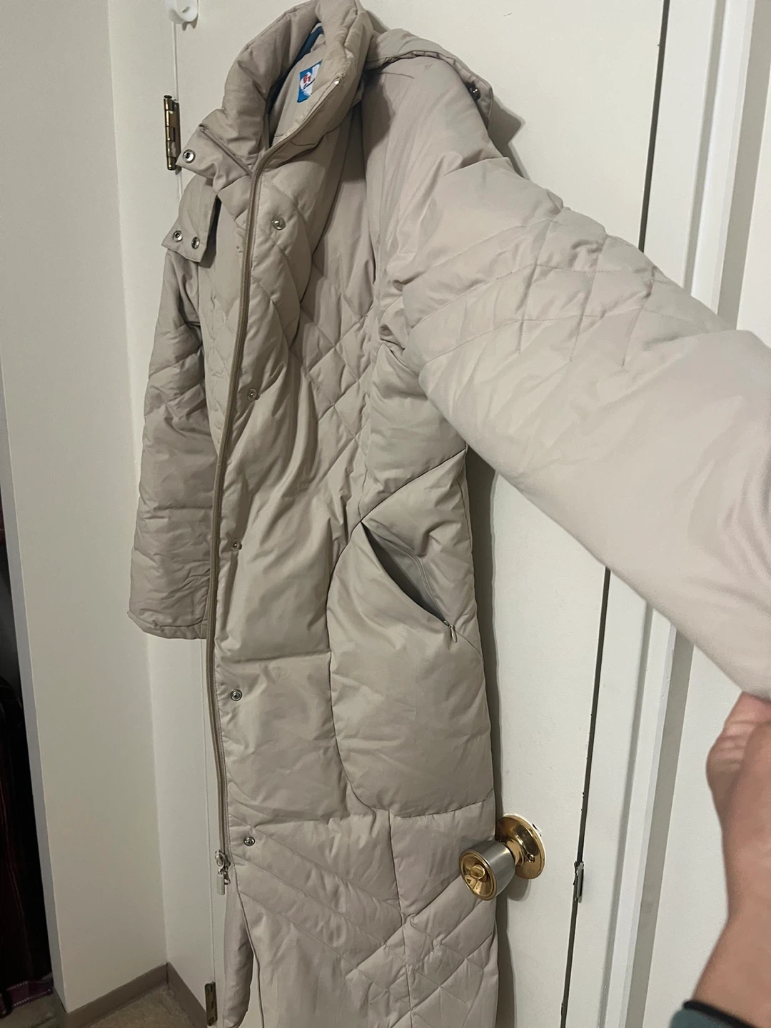 Here's a vintage tan puffer coat! It's perfect for staying warm and stylish during the colder months. The coat has a quilted design and a long length, making it a great addition to any wardrobe