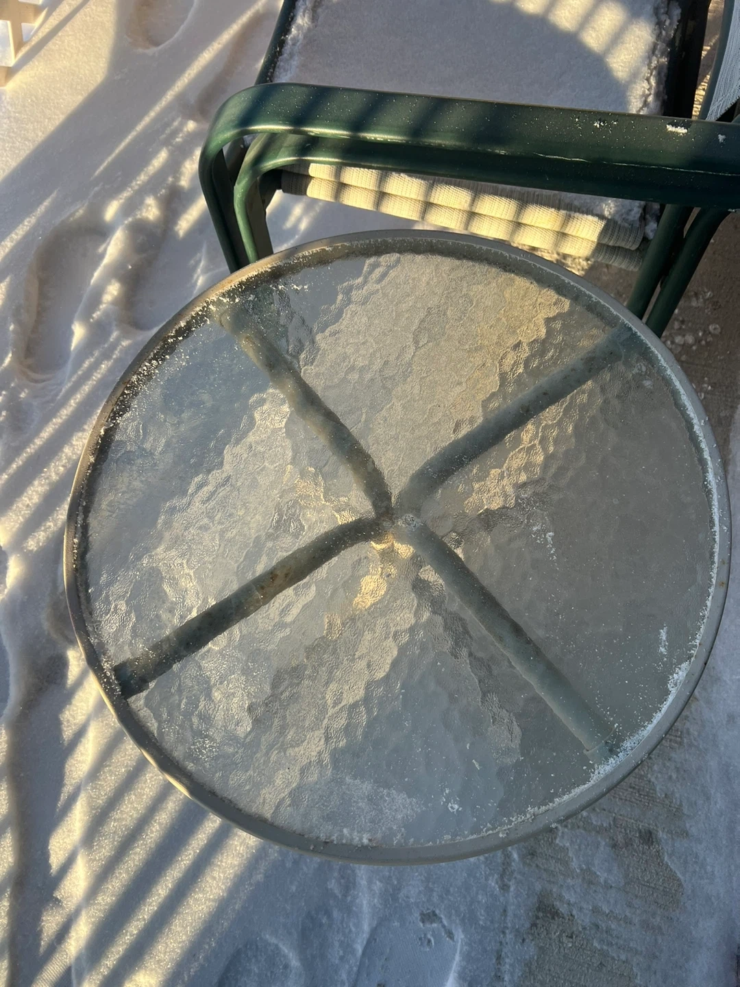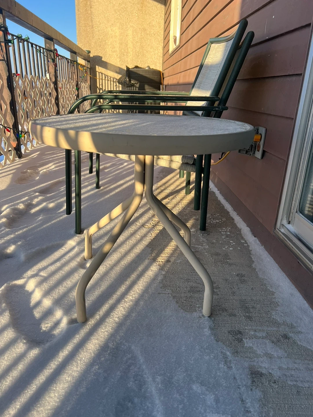 Selling a small outdoor side table with a glass top. It's perfect for a balcony or small patio. The table is in good condition and ready for use!