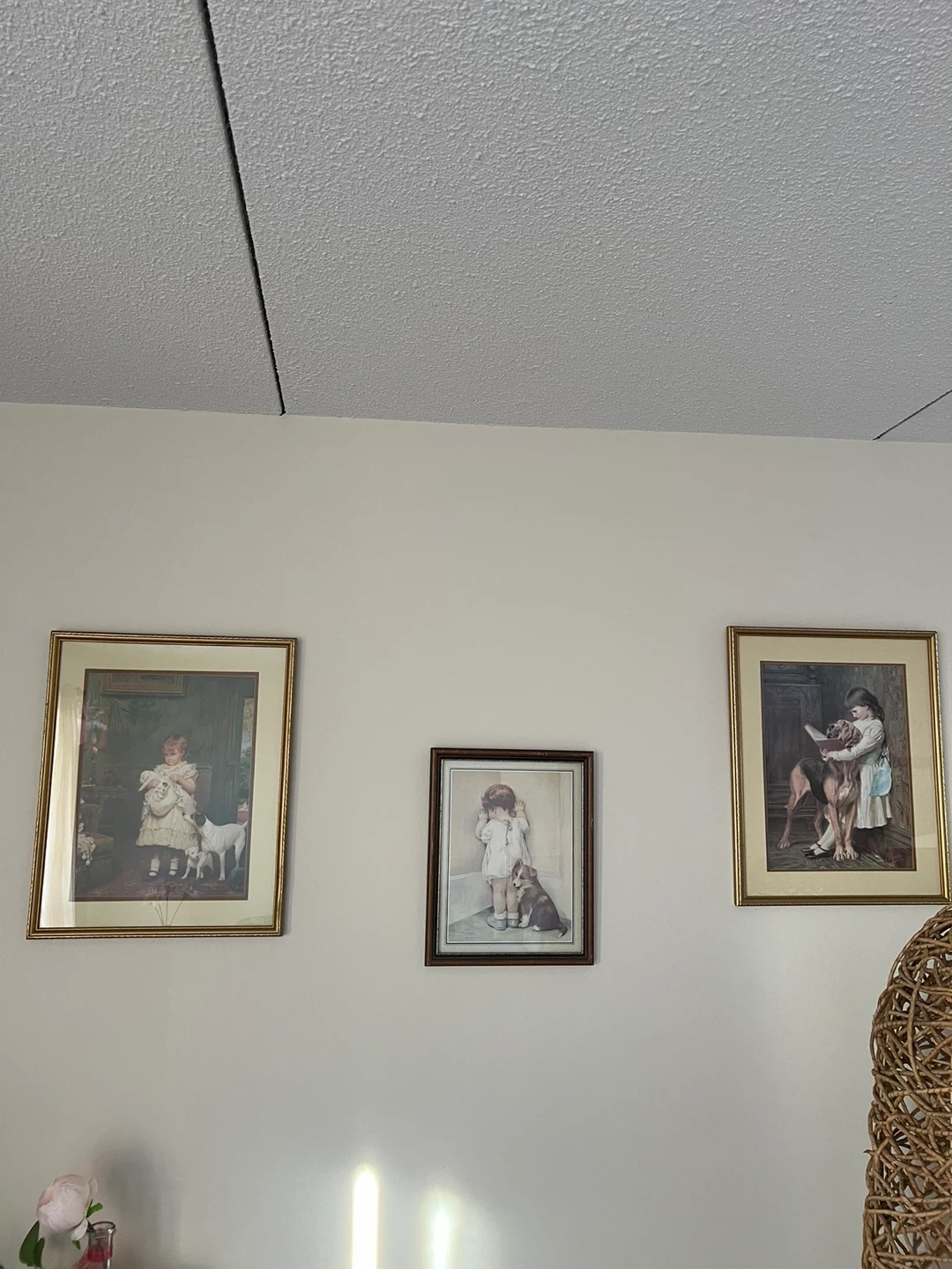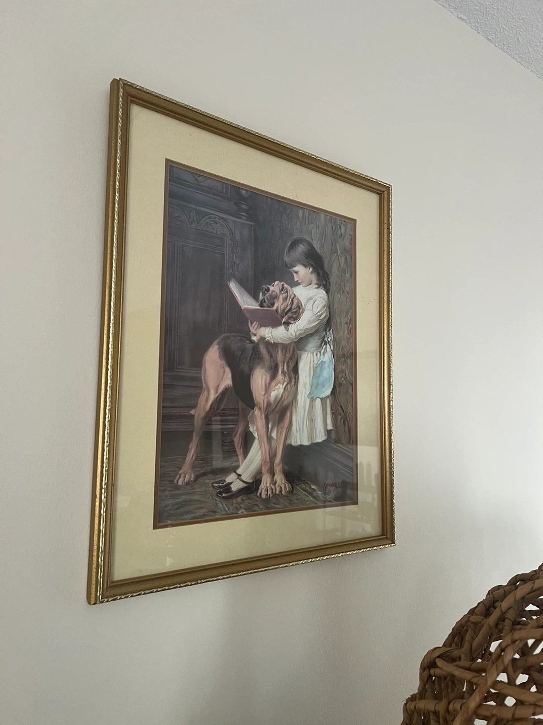 The right print shows a girl reading to a large dog.