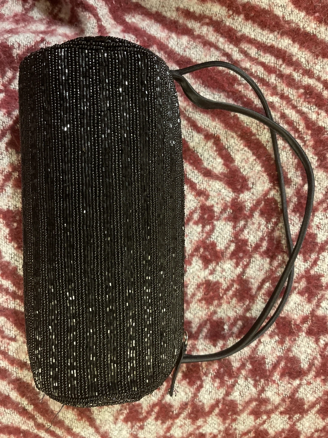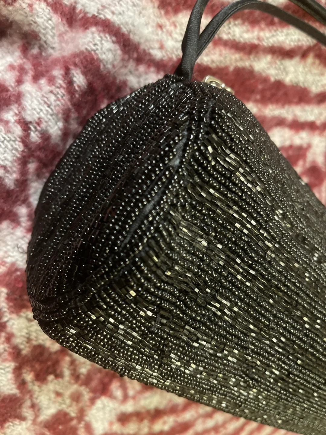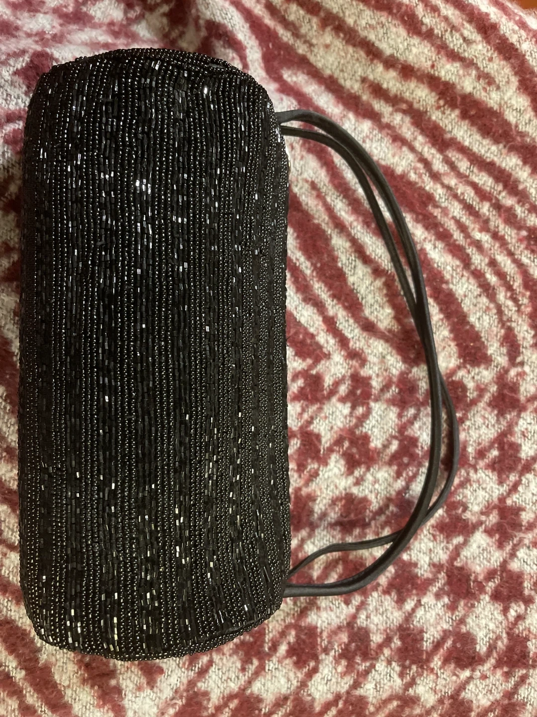Here's a lovely black beaded evening bag! It's perfect for adding a touch of elegance to any outfit. It has a simple drawstring closure and is in great condition for a night out or special occasion