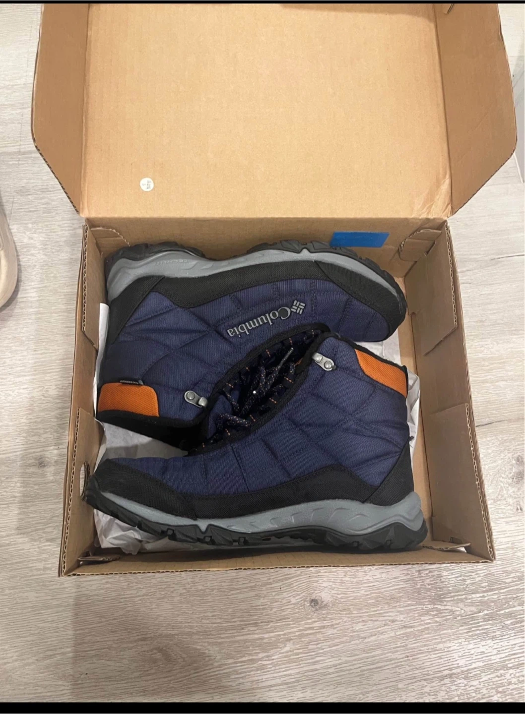 Selling a pair of Columbia Firecamp Boots for men, size 8. These boots feature 200g insulation and are waterproof. The colour is Collegiate Navy/ Bright Copper.