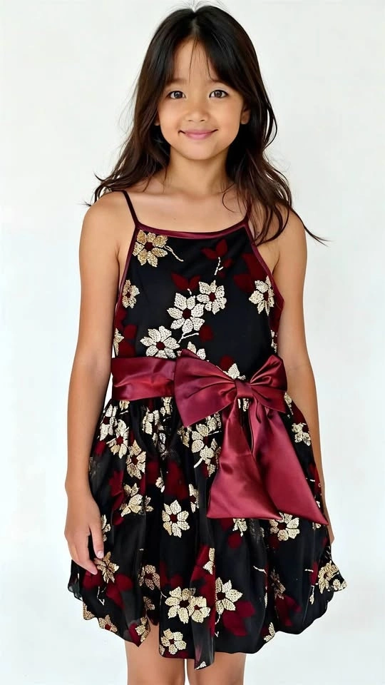 Emerald Sundae Kids Dress with Burgundy and Gold Floral Design