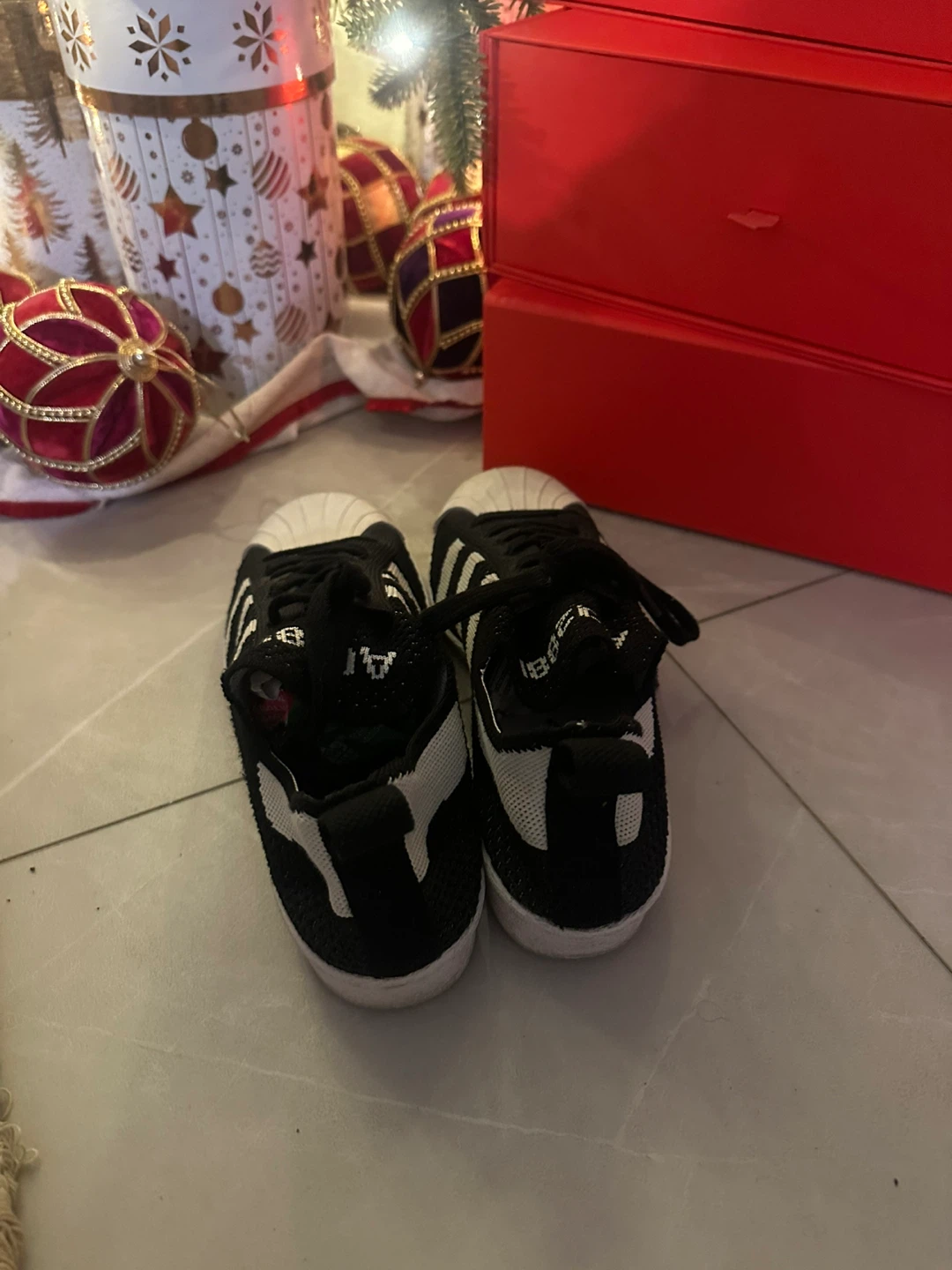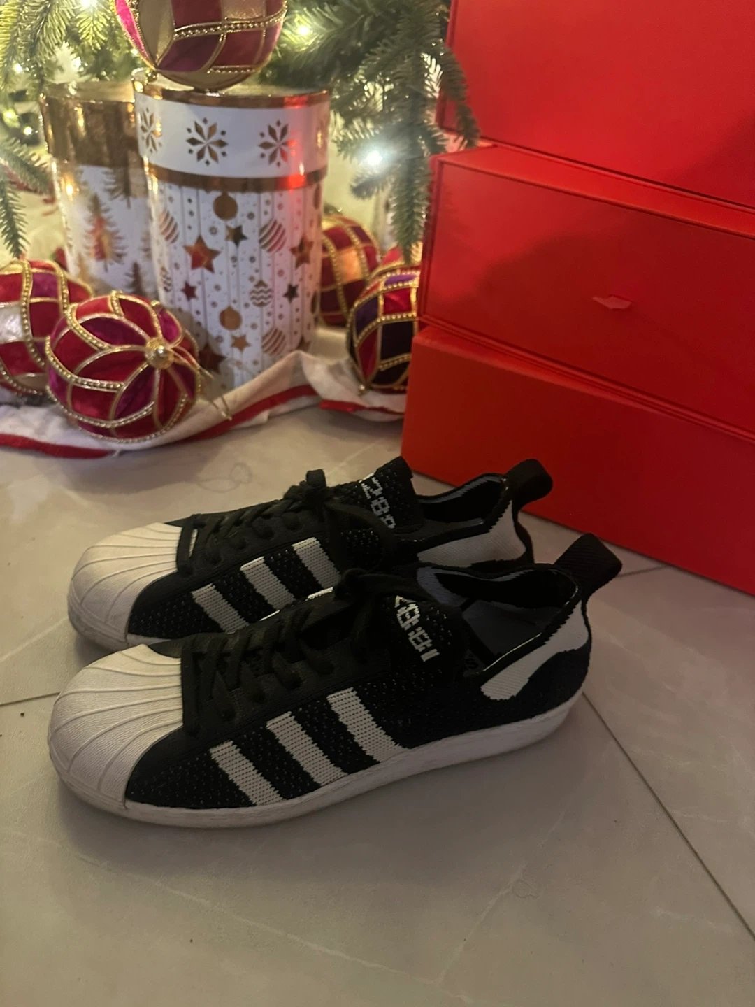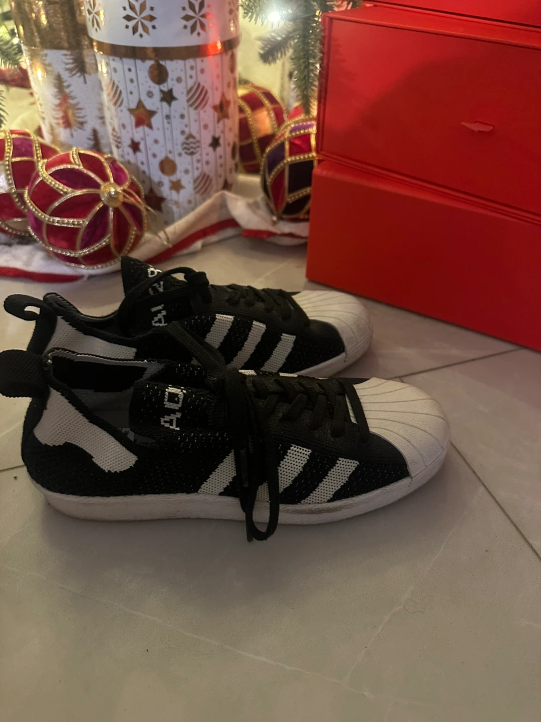 Selling a pair of Adidas Superstar knit shoes in black and white. They are size 6 US. Great for everyday wear!