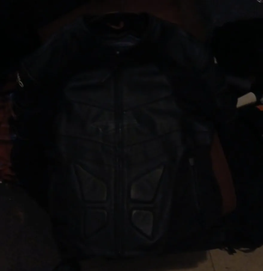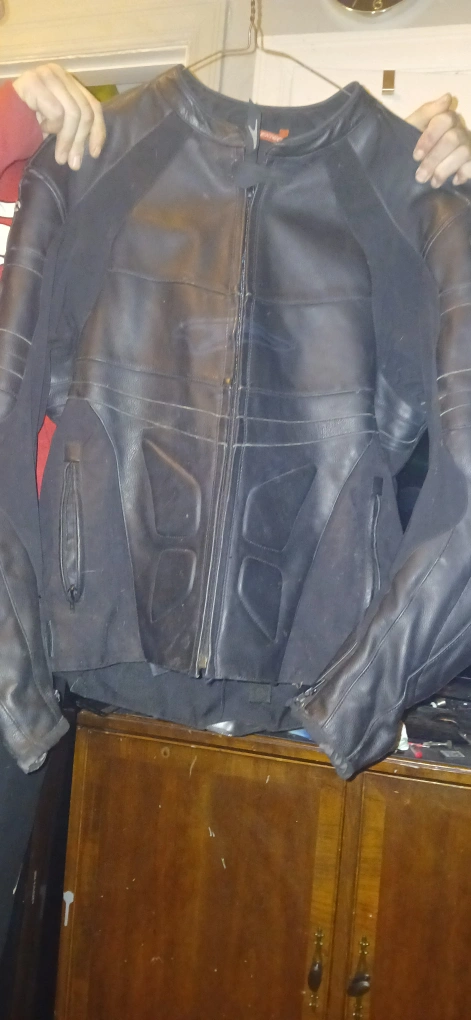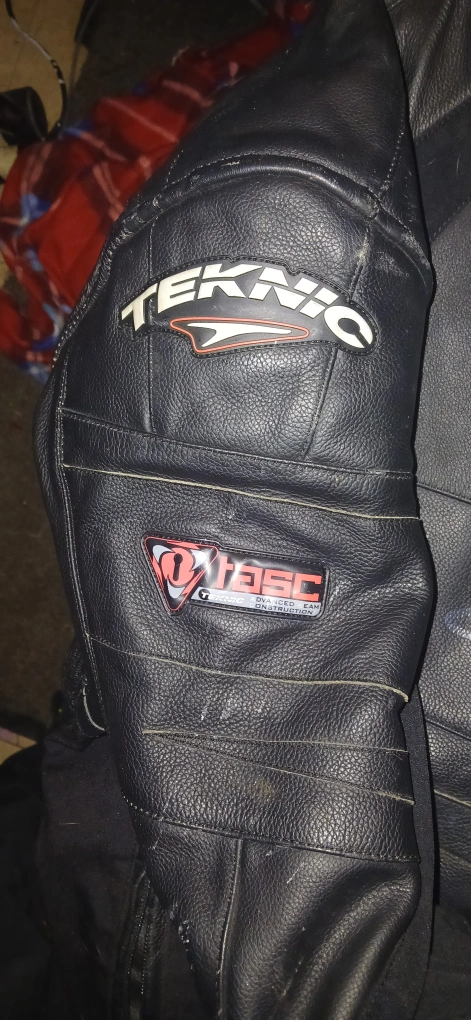 Selling a Teknic leather motorcycle jacket in size 48. It's black and made of leather and nylon. The lining is 100% polyester. Great for riding!