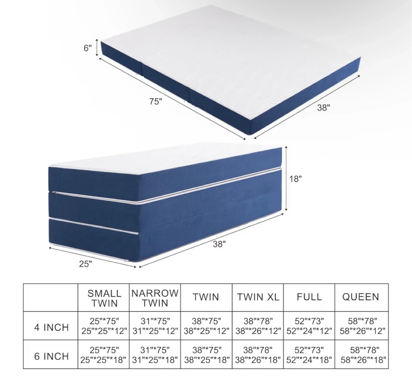 This is a tri-fold mattress in a twin size, perfect for yoga, camping, or as a bed! It's blue and white, and comes with a carrying case. When unfolded, it is 75" x 38" x 6". Comes with premium mattress protector.