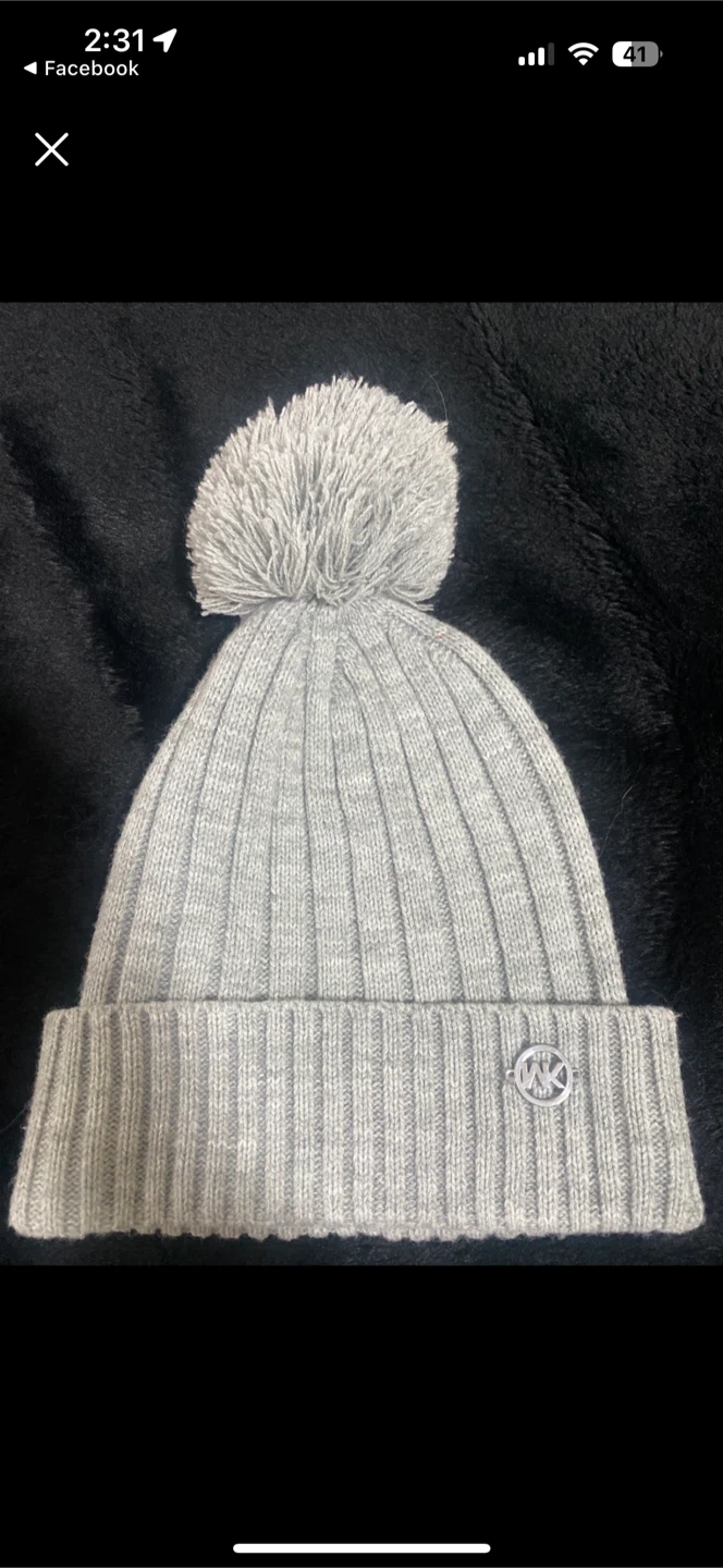 A stylish Michael Kors knit beanie in a lovely grey colour! It features a cute pom on top and the MK logo emblem on the brim, perfect for staying warm and fashionable during the colder months pick up cash only