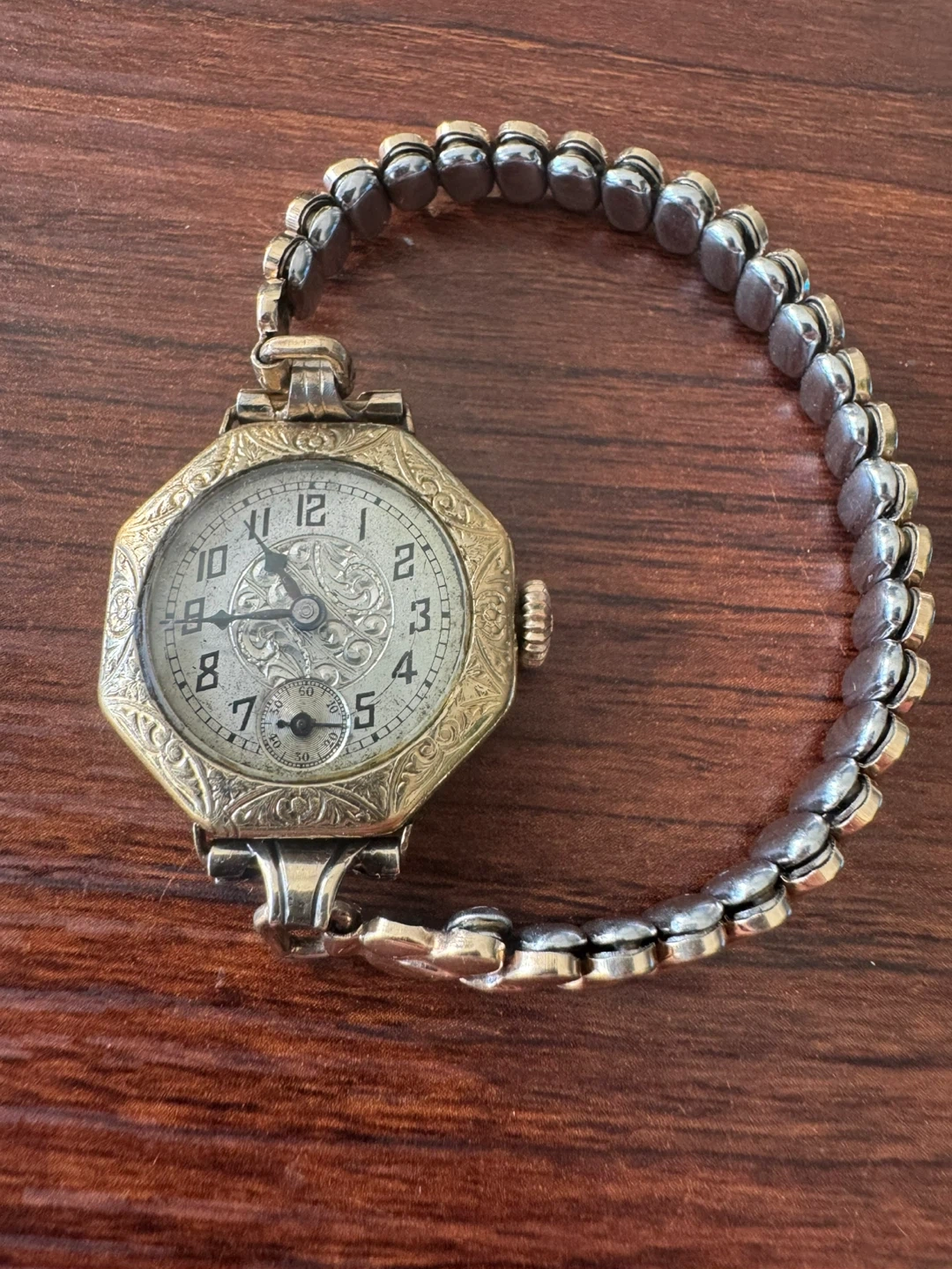 Here's a lovely vintage ladies' wristwatch with an octagon-shaped face. It has a beautiful decorative design on the dial and bezel. The band is a unique linked style. It's in good condition for its age!