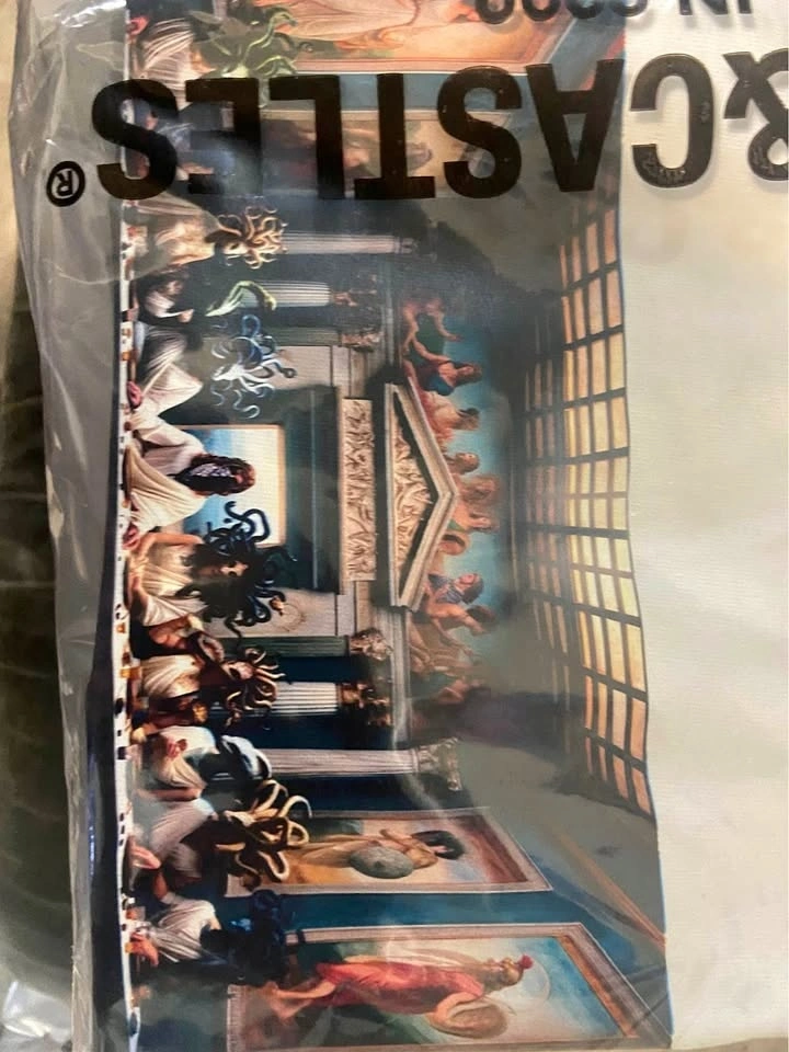 Brand new & Never worn! Didn’t realize the people around “Crip Jesus” are aliens till it came in and I got to check it out, very cool. However I don’t wear white as I’m cursed and immediately stain any white clothes I wear, usually the first time I wear them lol.