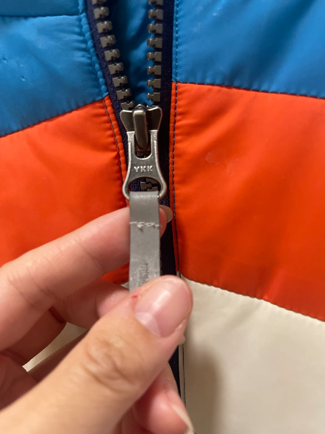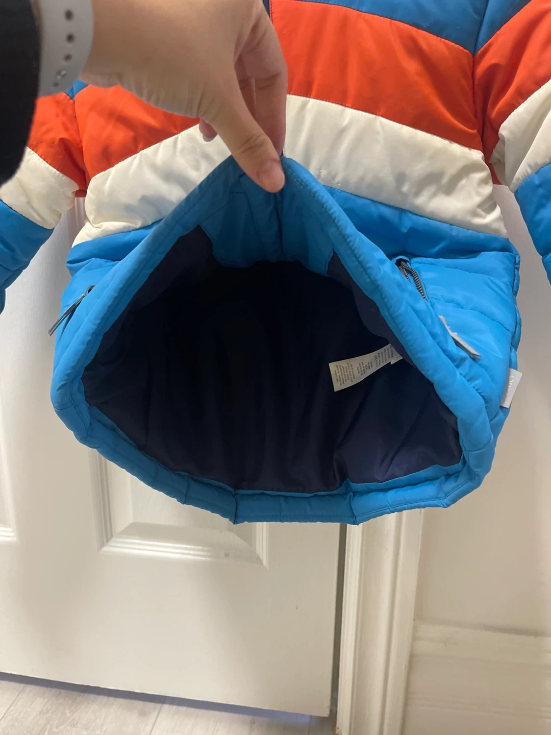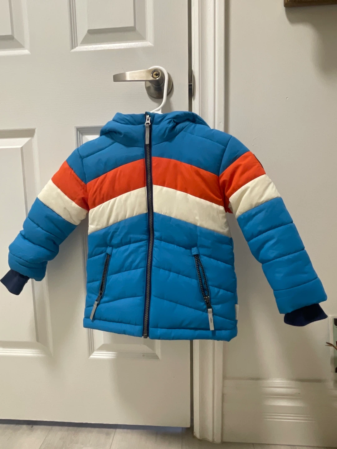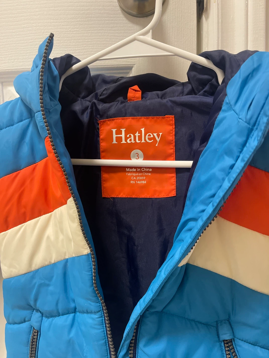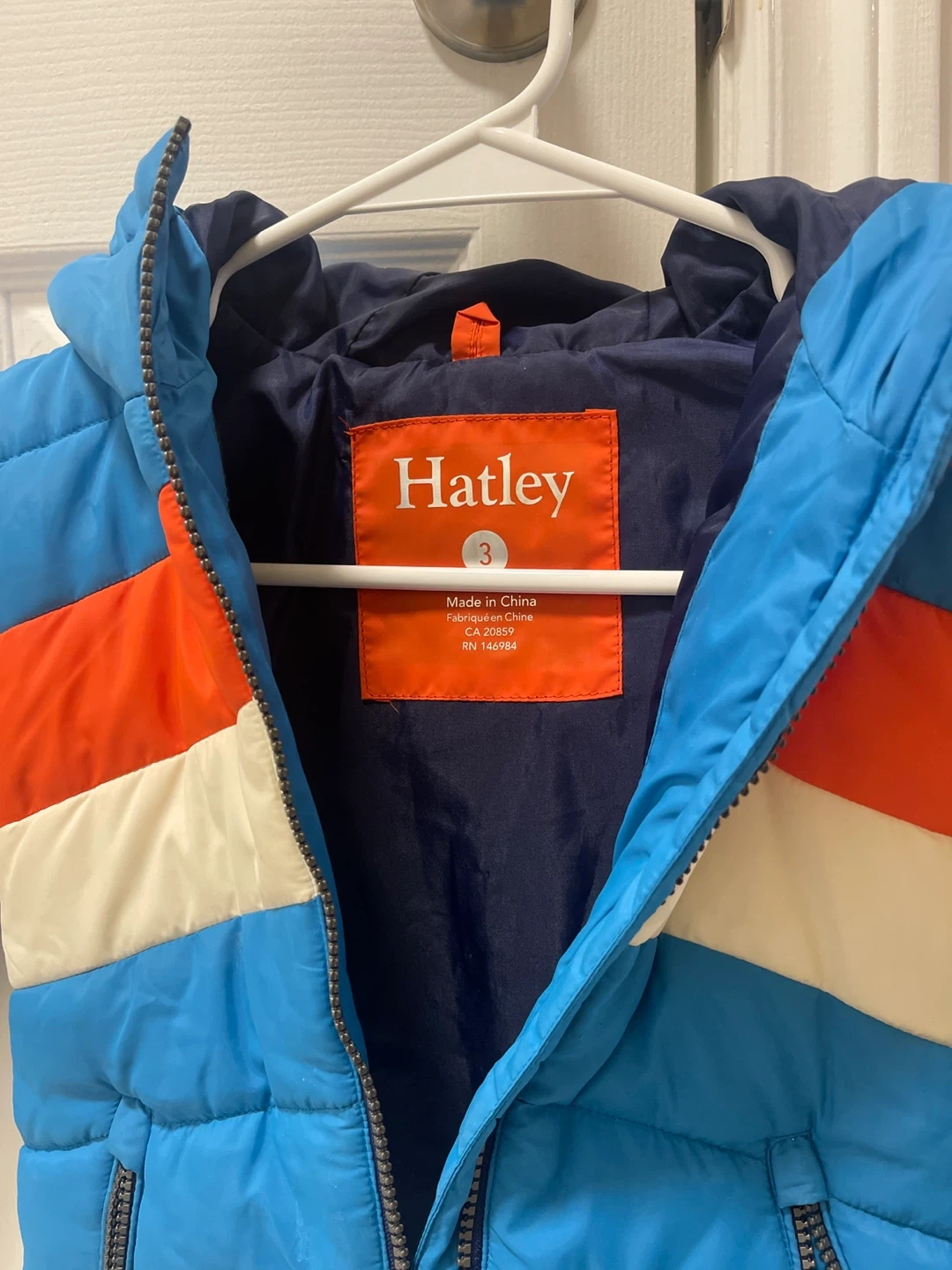 Here's a cute Hatley puffer jacket in size 3! It's in great condition and ready to keep your little one warm. The jacket features a fun colour block design with blue, orange, and white stripes. Perfect for those chilly Canadian days!