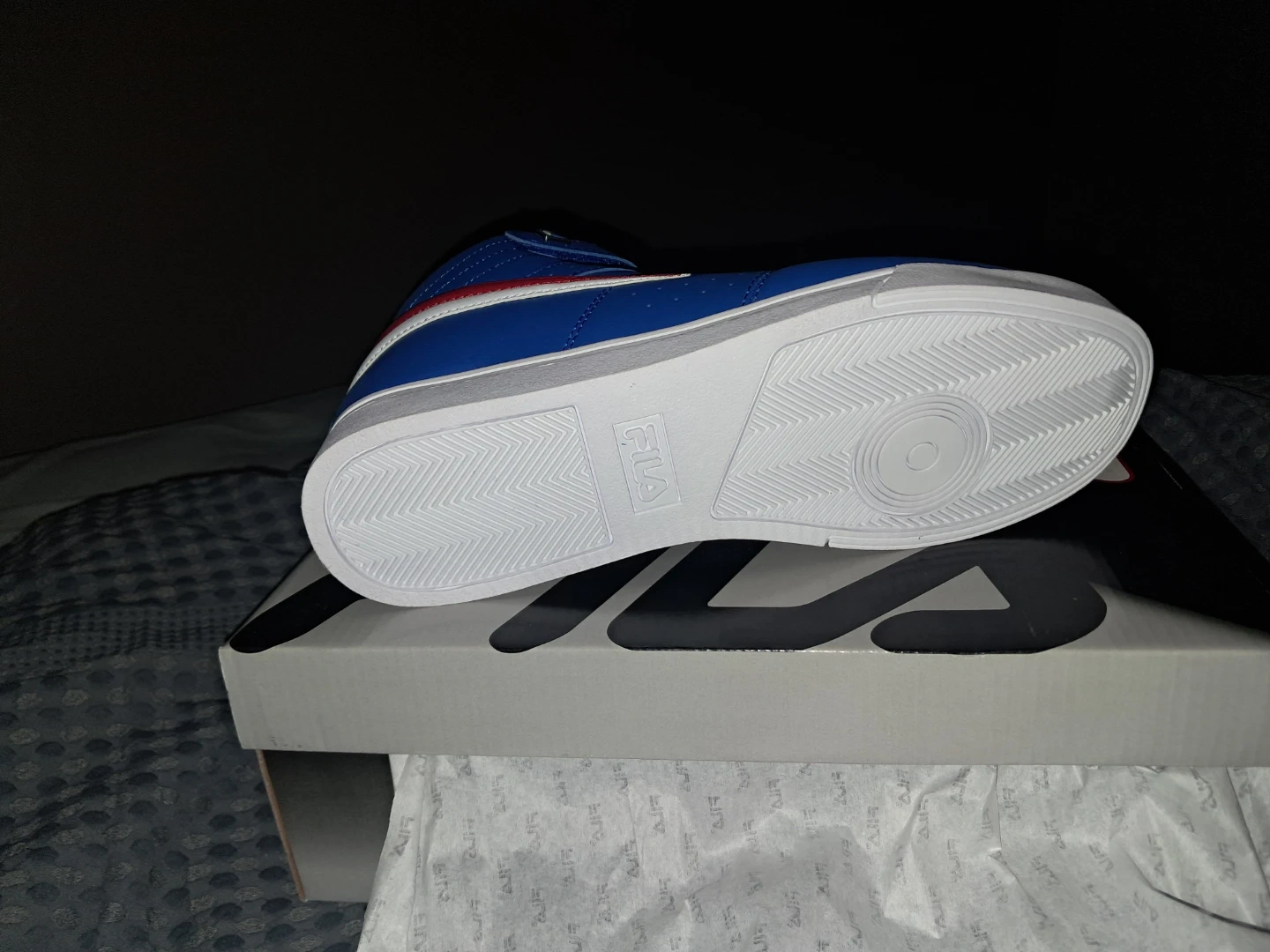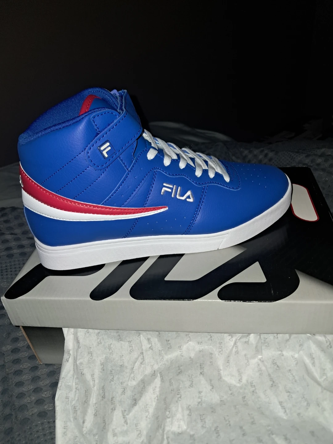 These Fila F-13 Hi Top sneakers are brand new and ready to go! They come in a vibrant blue colour with red and white accents. Size 10. The box is included!