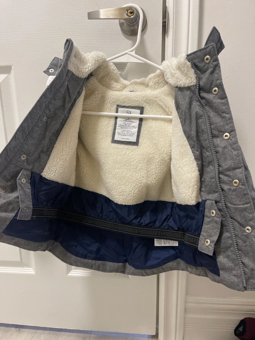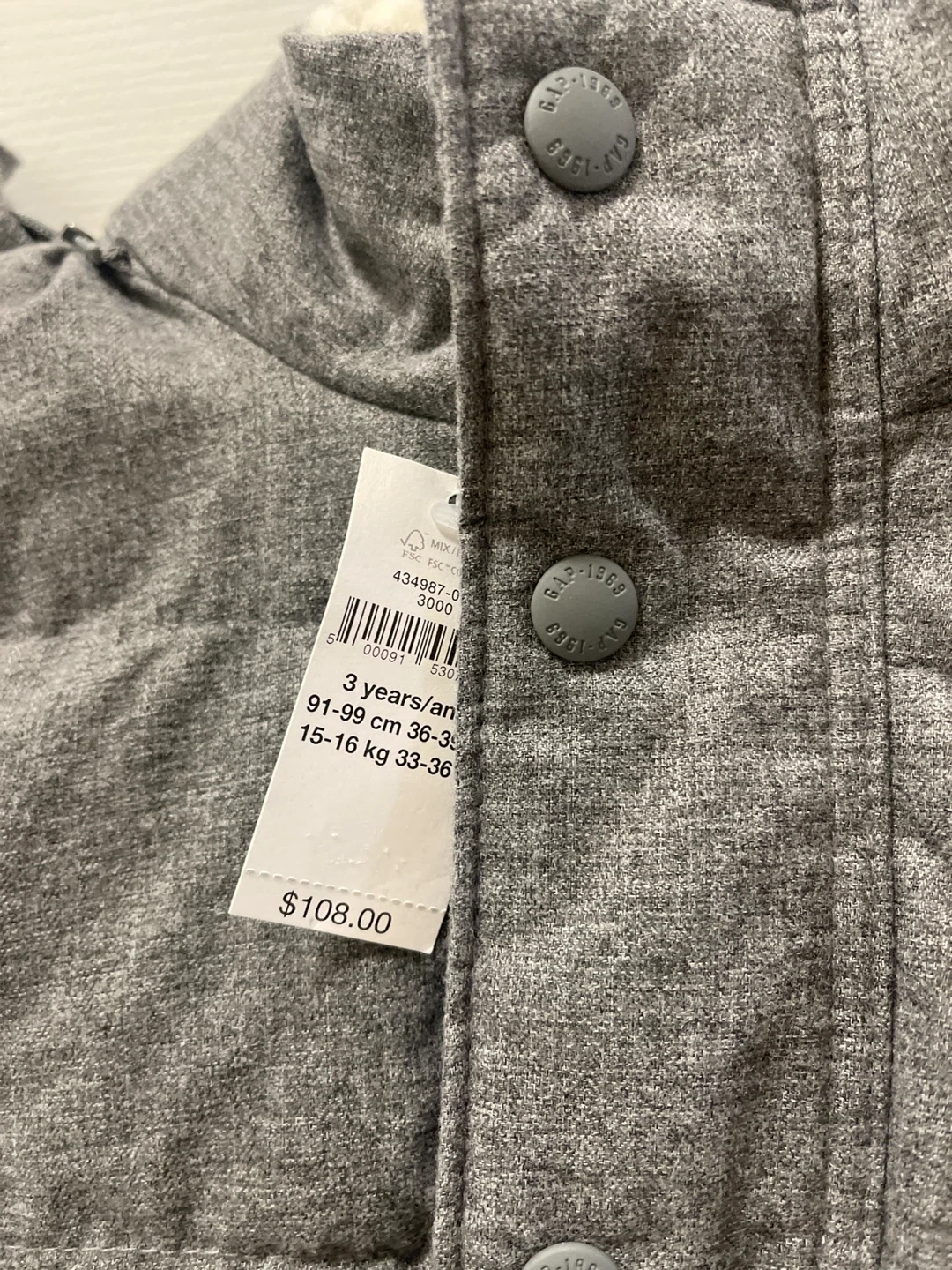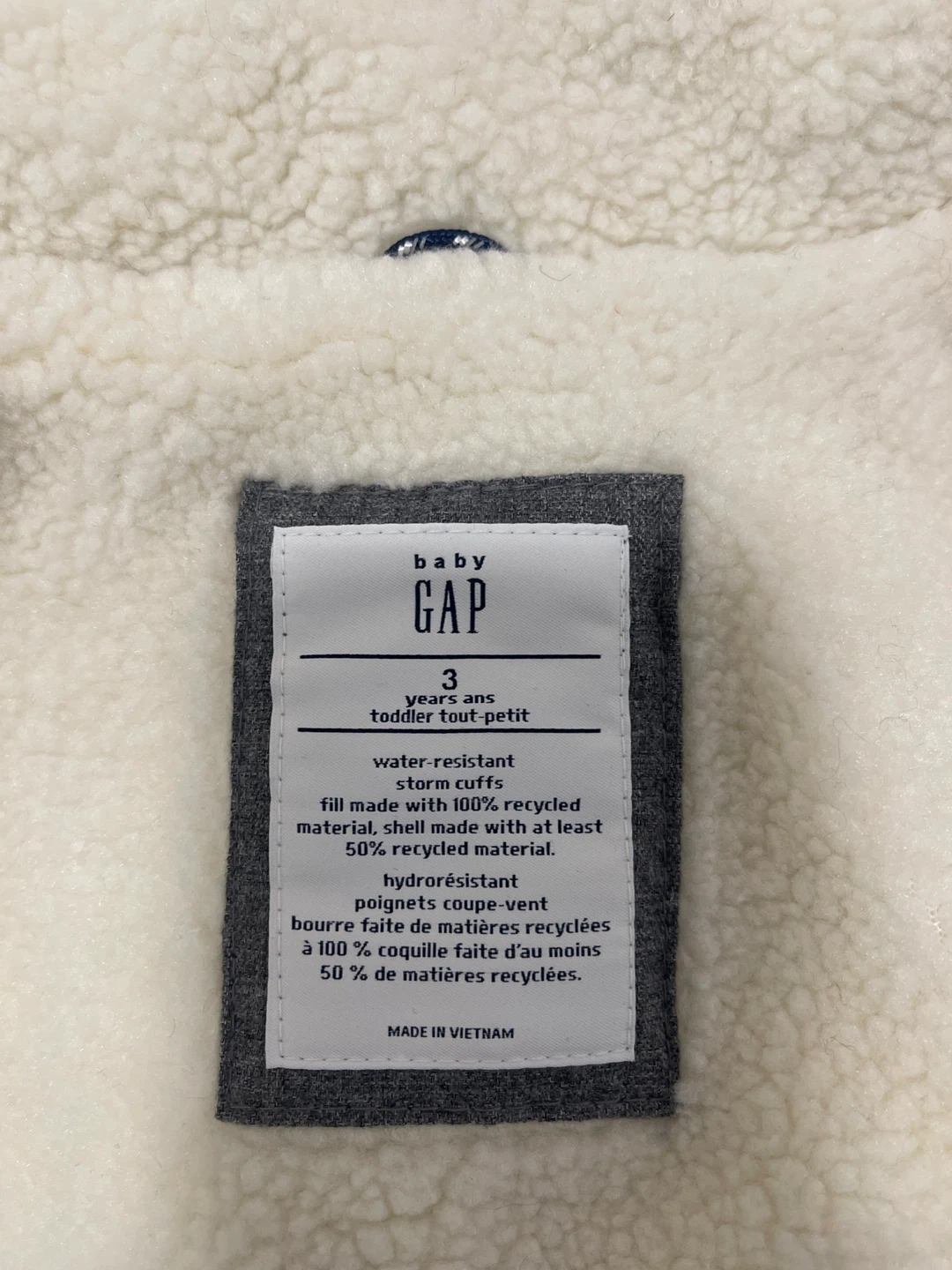 A cozy kids Gap puffer jacket for a 3-year-old! It's a stylish grey colour with a soft, sherpa-like lining to keep your little one warm.