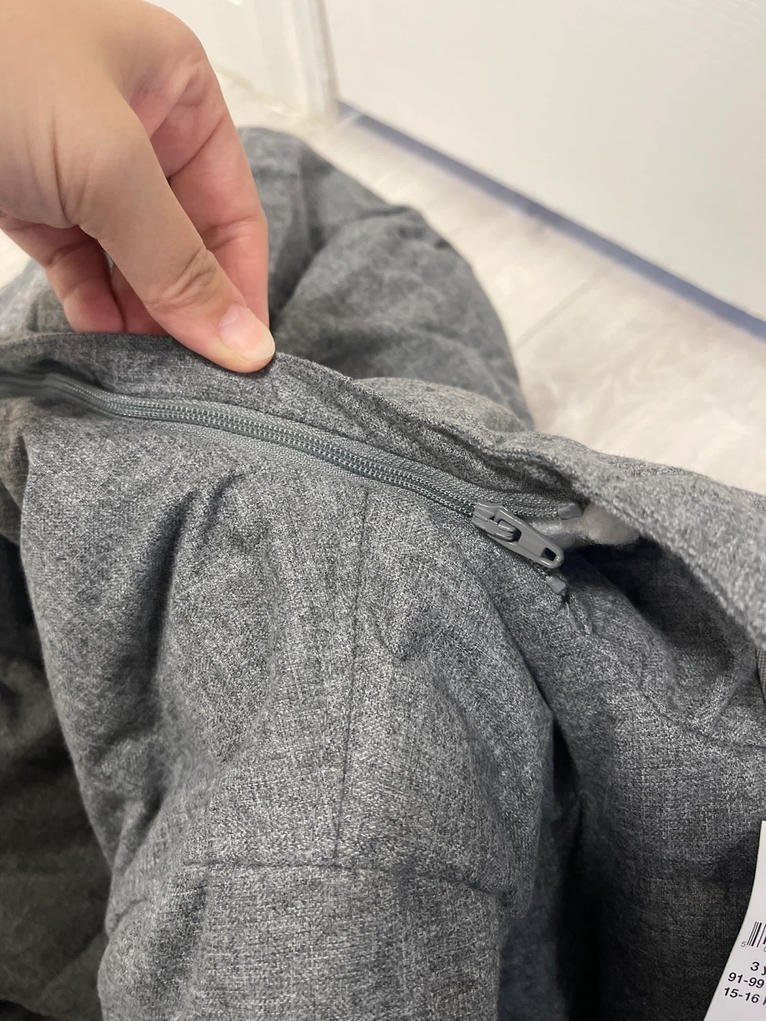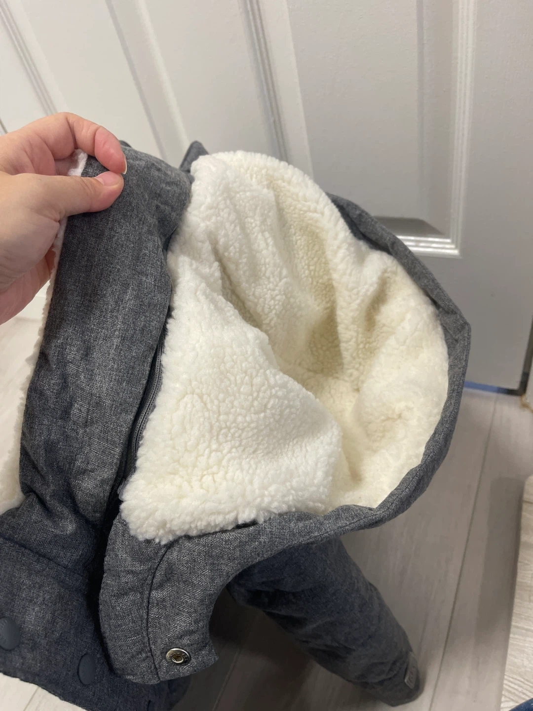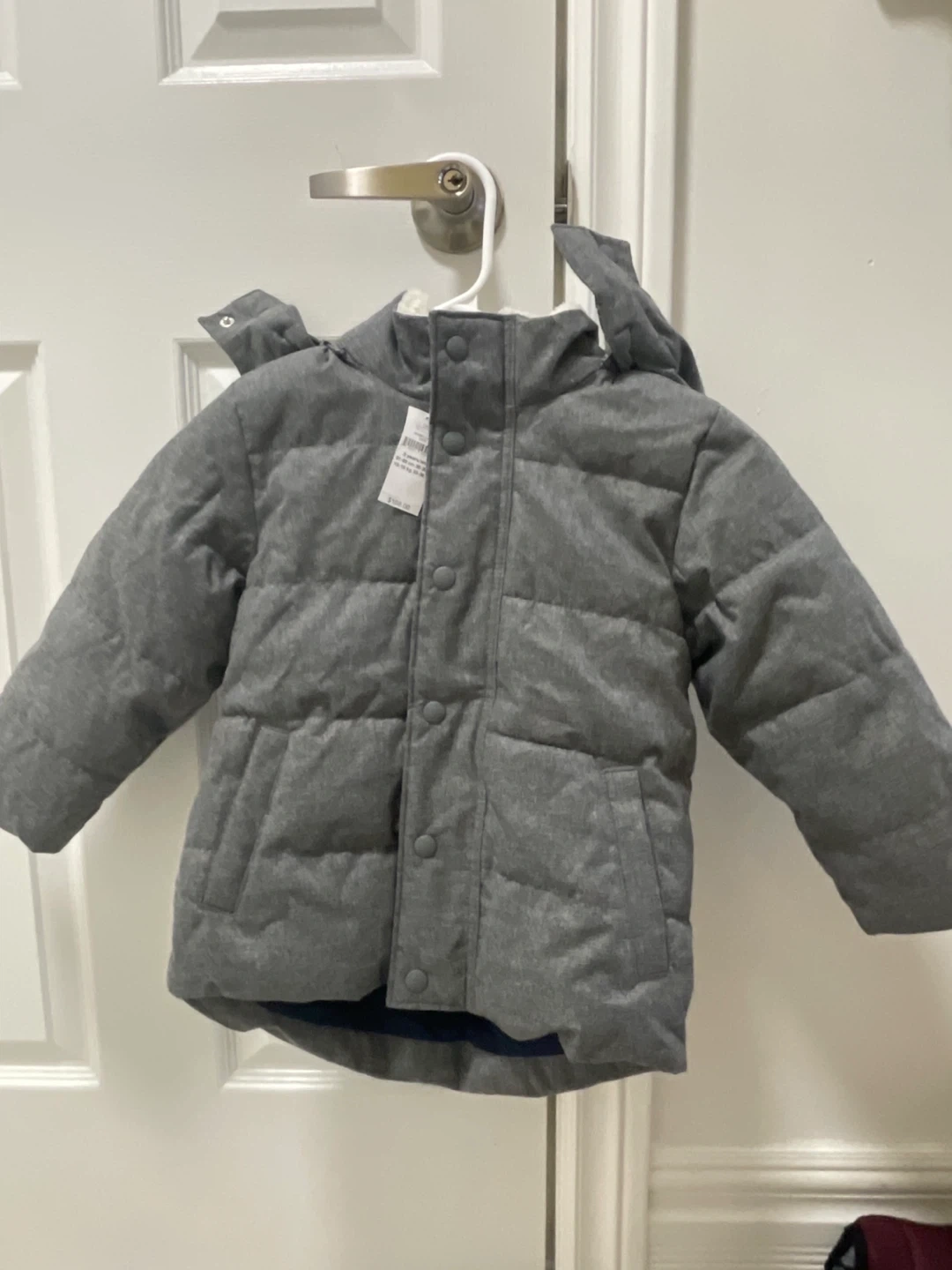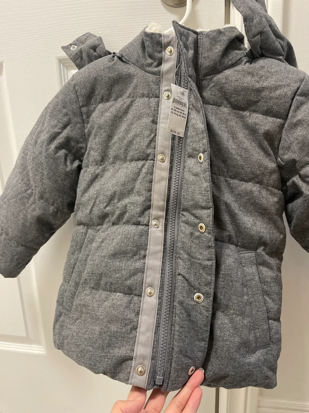 A cozy kids Gap puffer jacket for a 3-year-old! It's a stylish grey colour with a soft, sherpa-like lining to keep your little one warm.