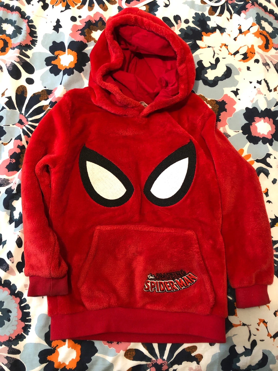 Here's a fuzzy red hoodie featuring The Amazing Spider-Man logo! It has a hood and a front pocket, perfect for keeping cozy. It's in great condition and ready for a new fan