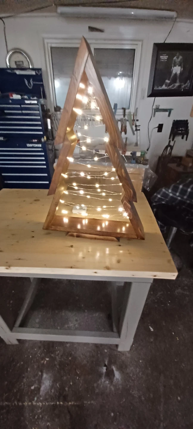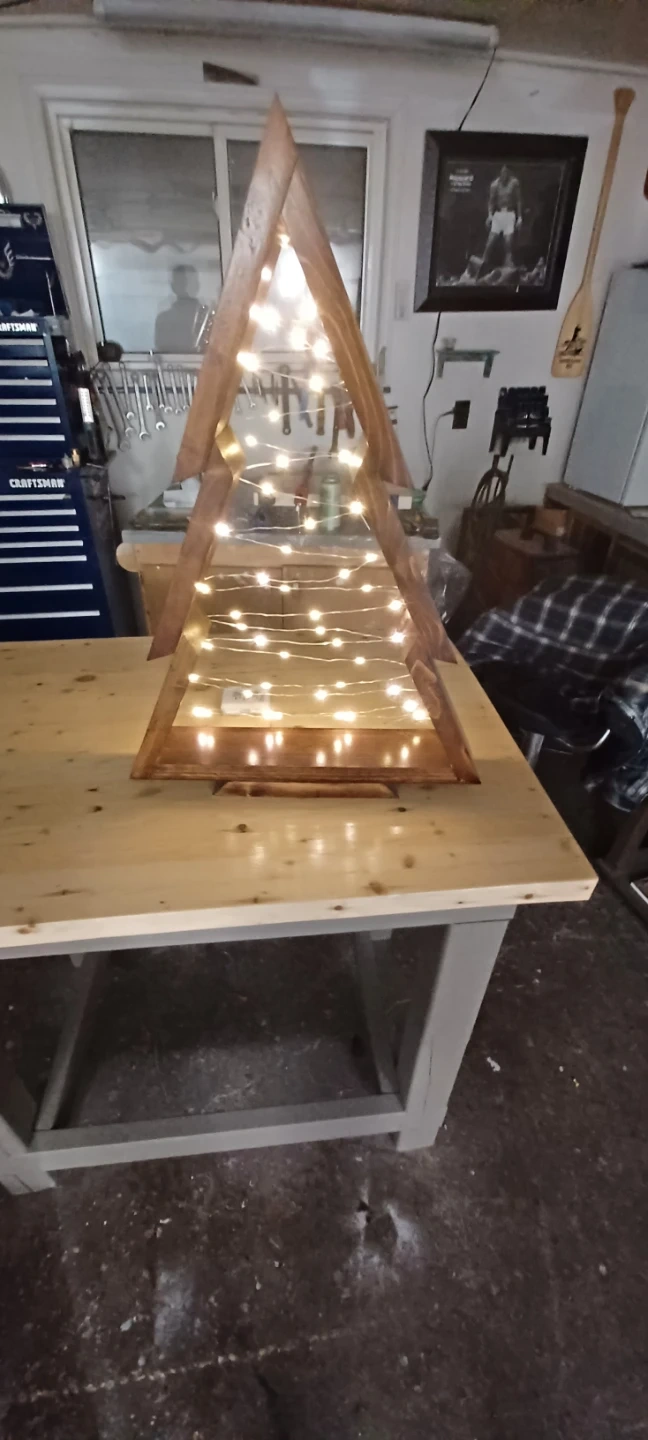 Check out this charming handmade wooden Christmas tree! It's decorated with string lights to add a warm and festive glow to any room. Perfect for adding a rustic touch to your holiday decor