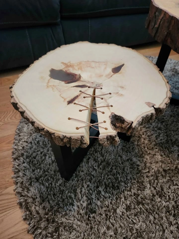 This hand crafted table set is the perfect combination of rustic and modern. The copper wire accents the natural tones in the wood beautifully and the bark left intact gives them a natural cozy cabin feel. The knots are filled with a clear epoxy to increase functionality and enhance their appearance. The bark has been sealed with polyurethane to protect and strengthen the bond and the surfaces were sealed with Odies hardwax oil for durability and scratch resistance.