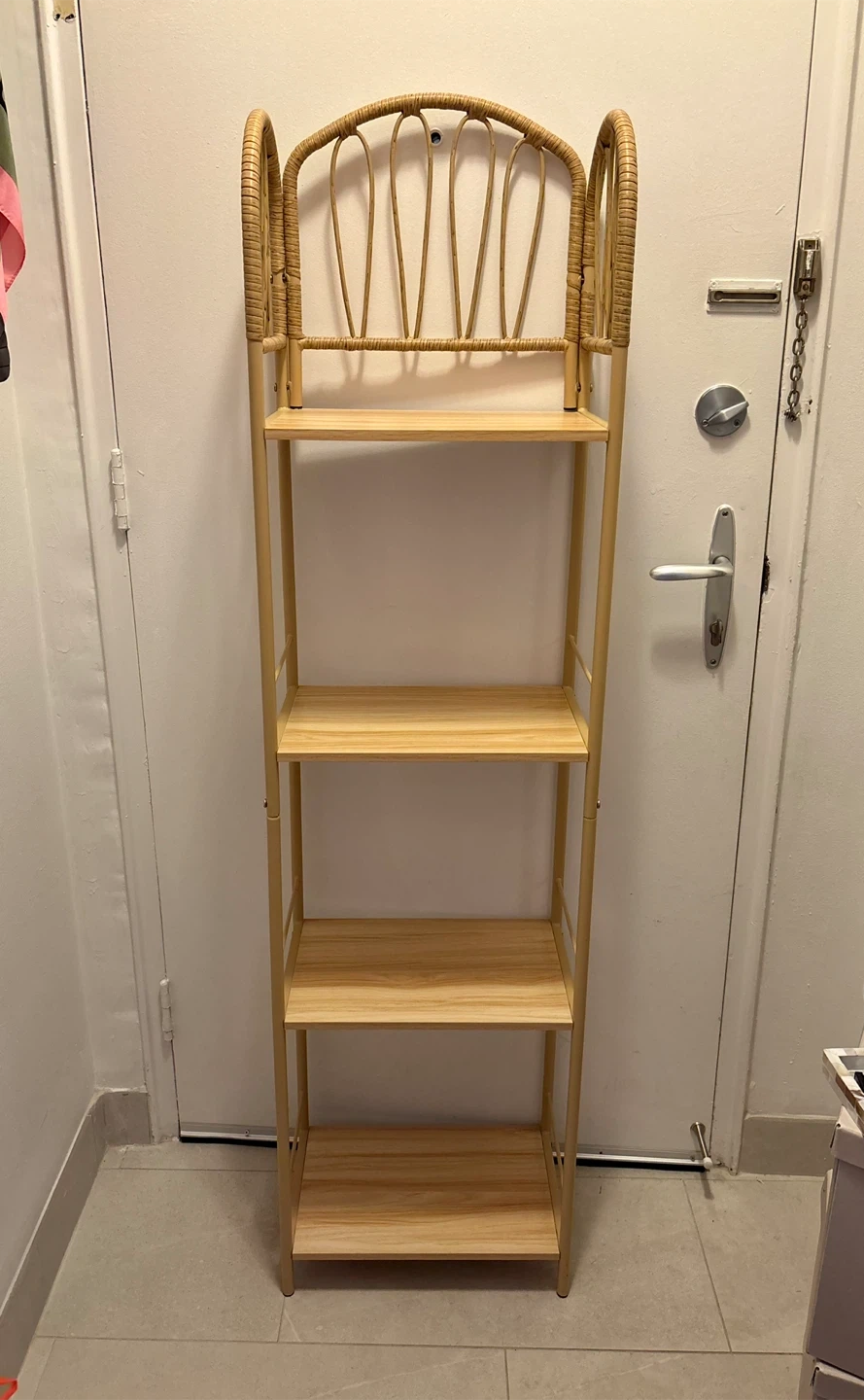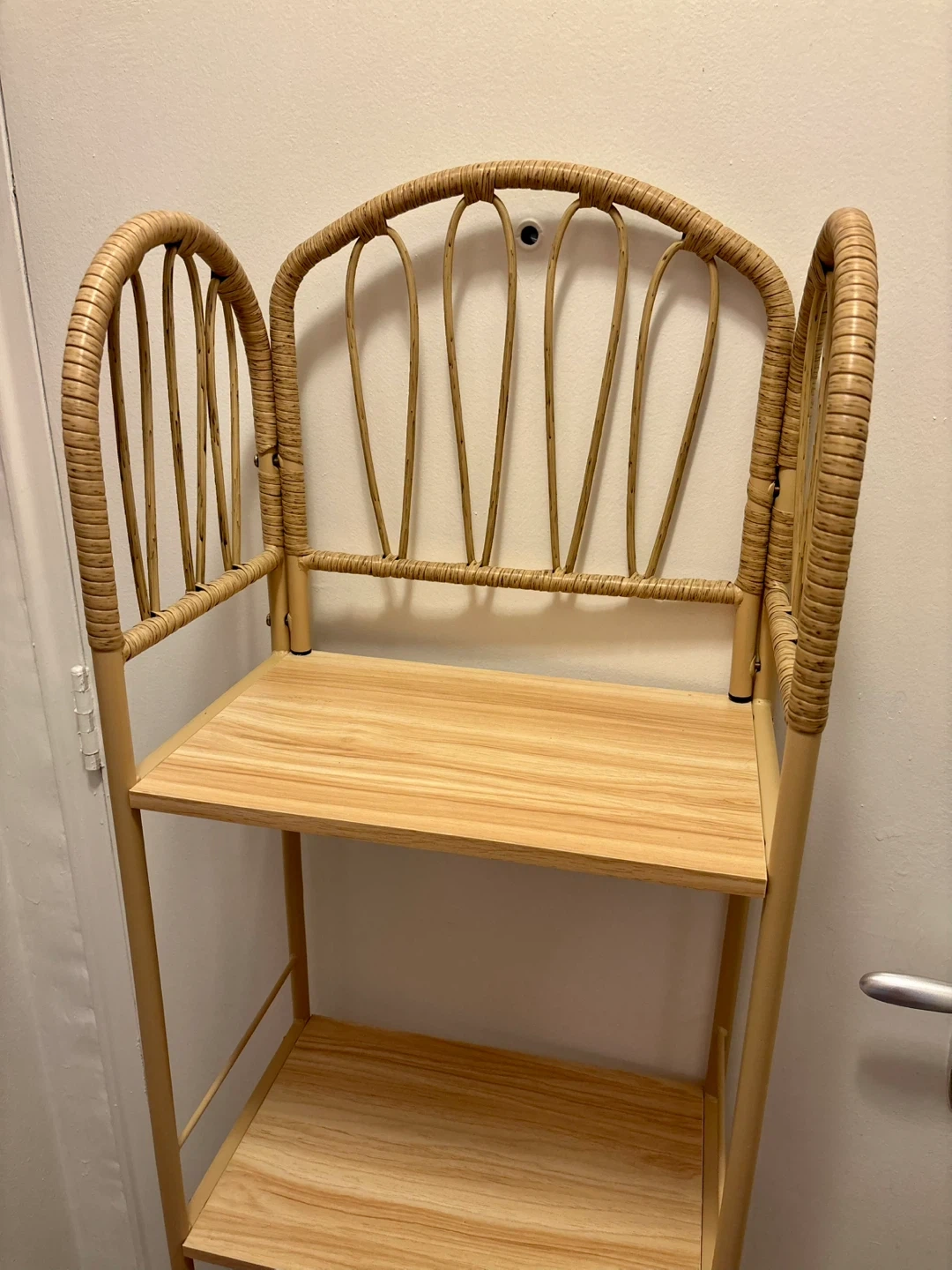 A slim rattan shelf that's perfect for adding a touch of natural style to any room! It's in great condition and ready to hold your favourite books, plants, or decor items. The four shelves are sturdy and have a lovely, light wood finish.