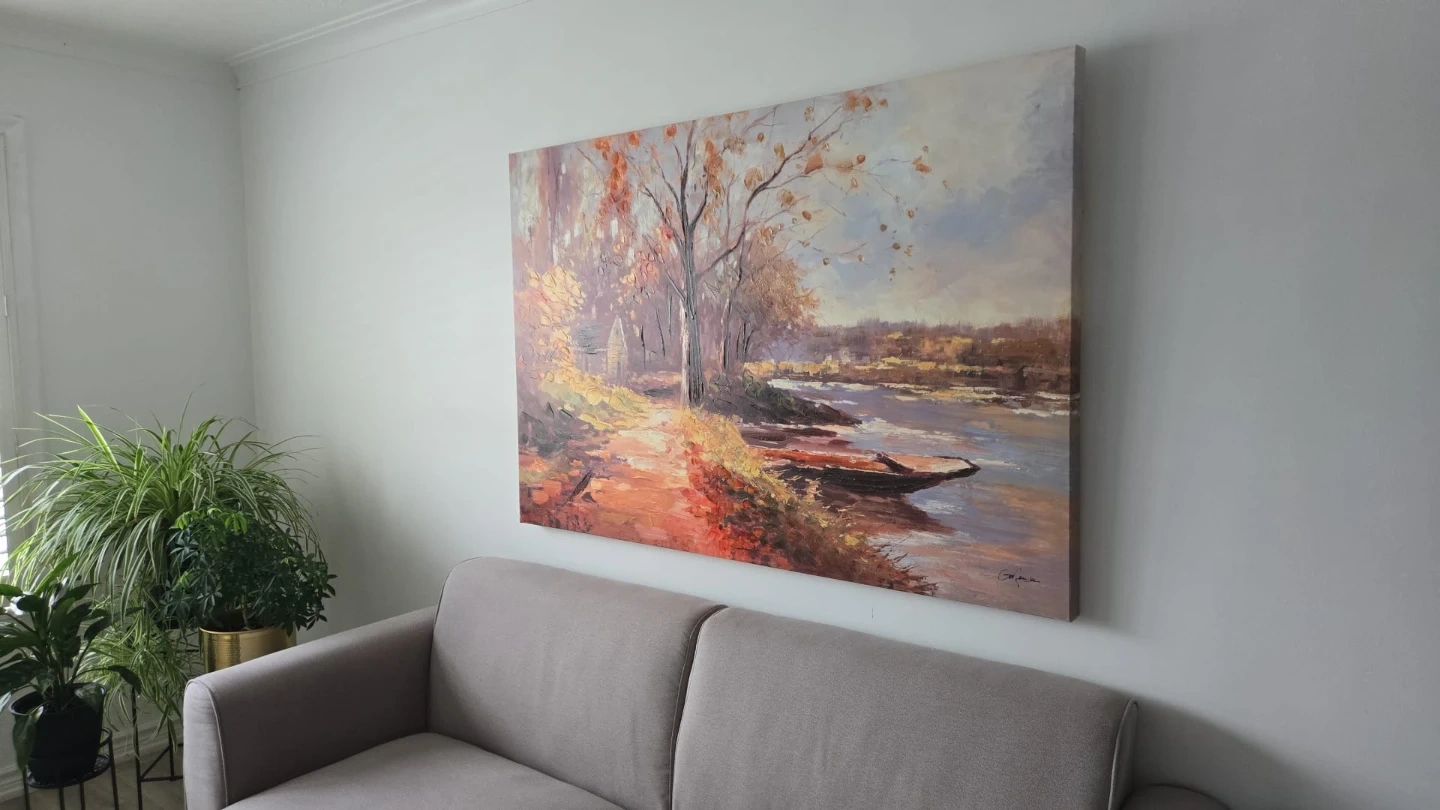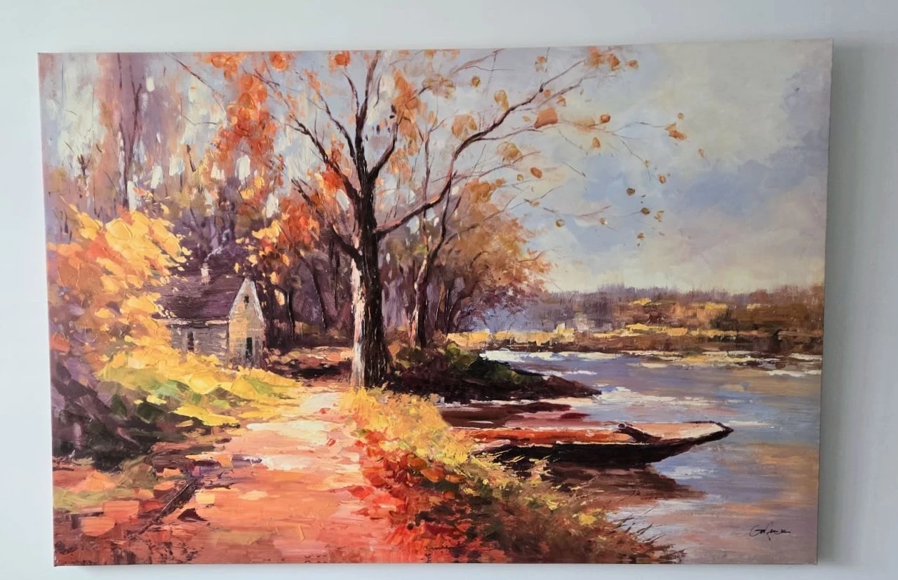 Add a touch of serene landscapes to your home with this used painting, capturing a tranquil river scene with autumnal foliage. The artwork features rich, warm tones and gentle brushstrokes, perfect for creating a calming atmosphere in any room. Though previously displayed, it remains in good condition and ready to enhance your living space.