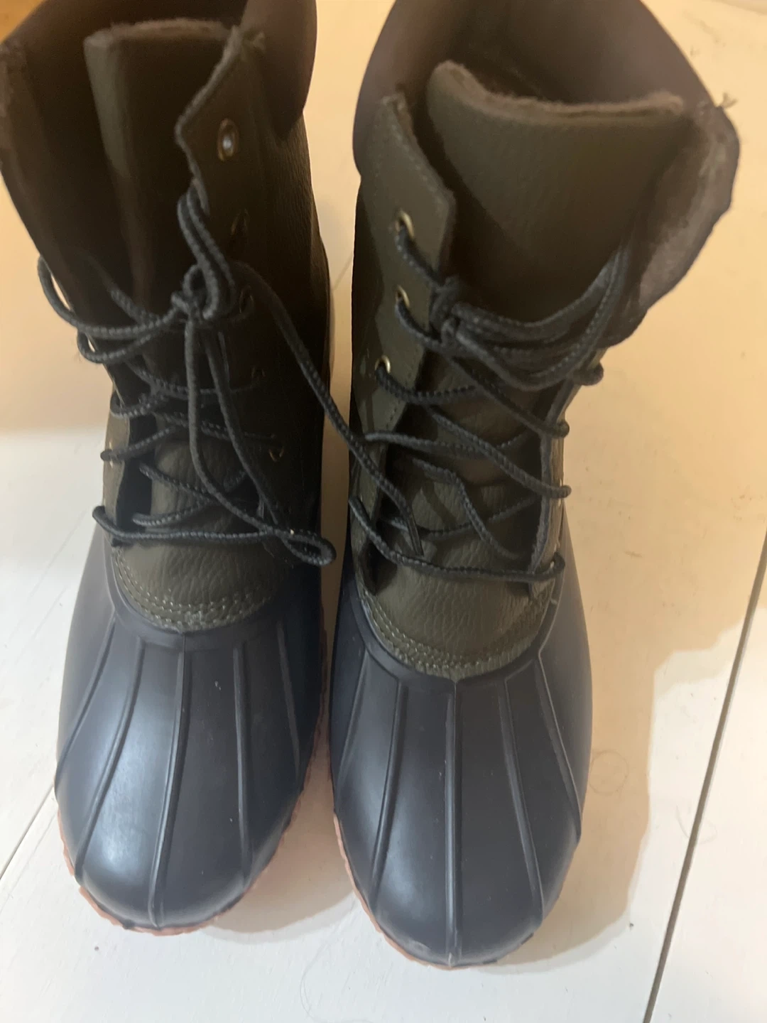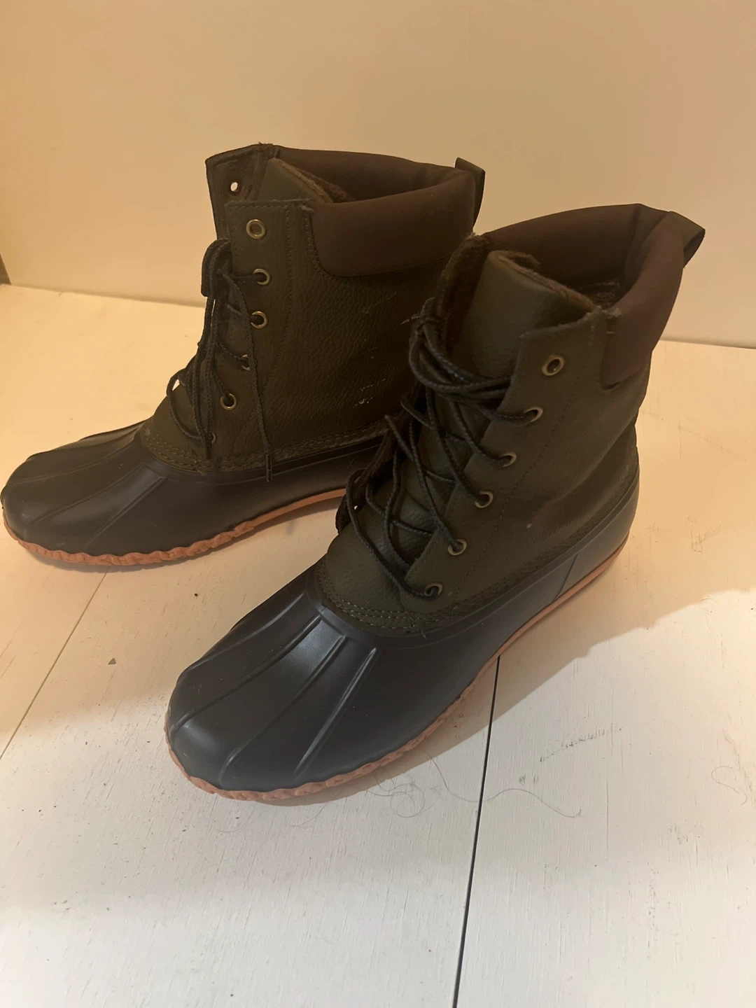 Selling a pair of Weatherproof Vintage Adam II duck boots in size 11M. They are in good condition and ready for the winter weather! These boots feature a man-made upper and outsole, with faux fur made of 100% polyester.