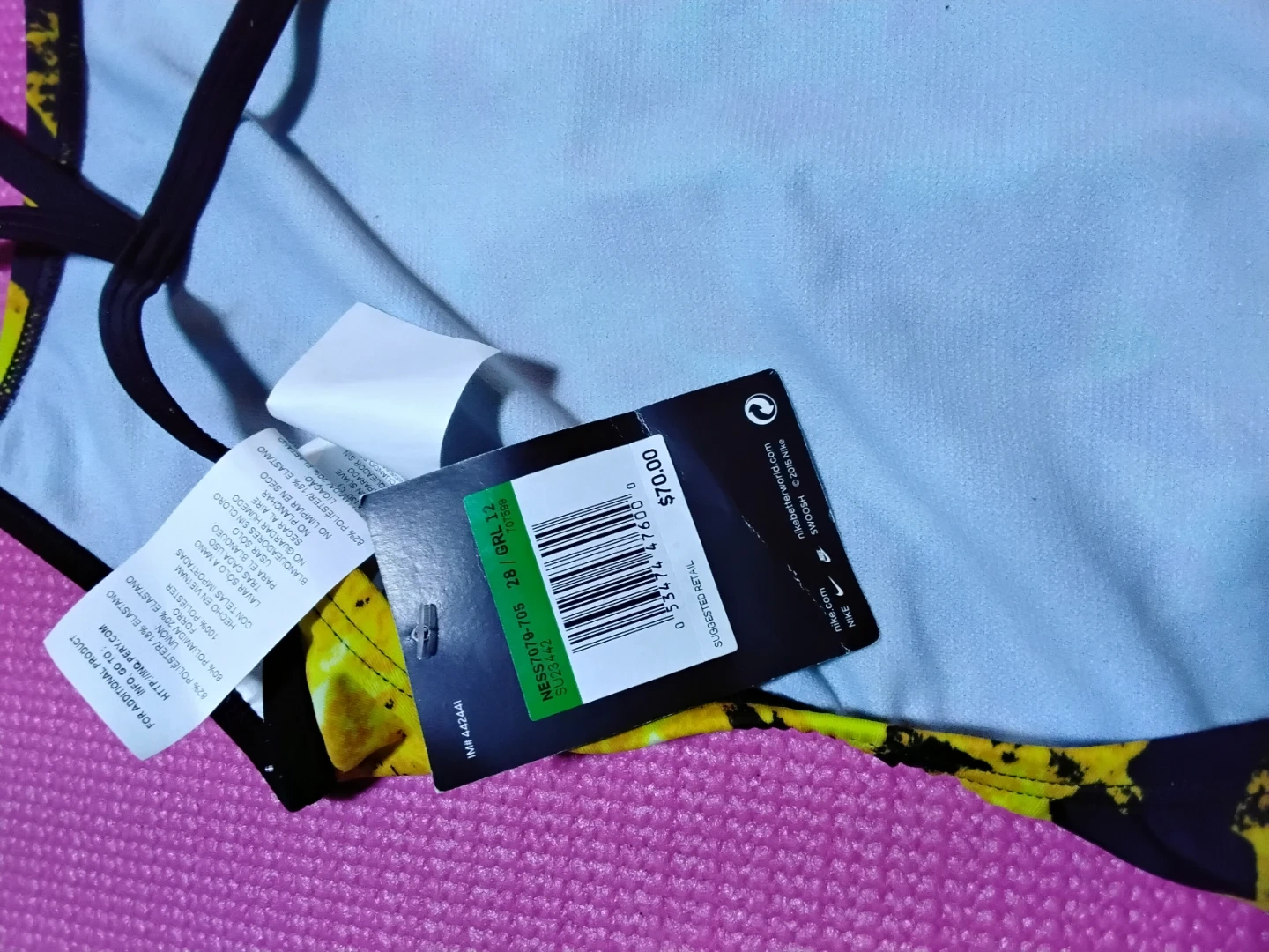 Selling a Nike swimsuit in size 12. It's a fun yellow and black pattern. The tag shows a suggested retail price of $70.00