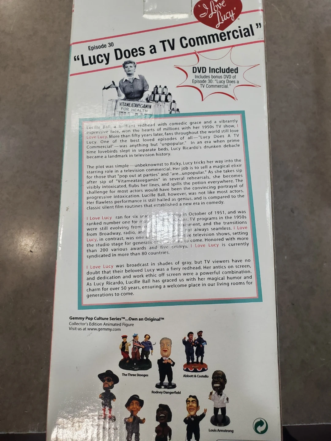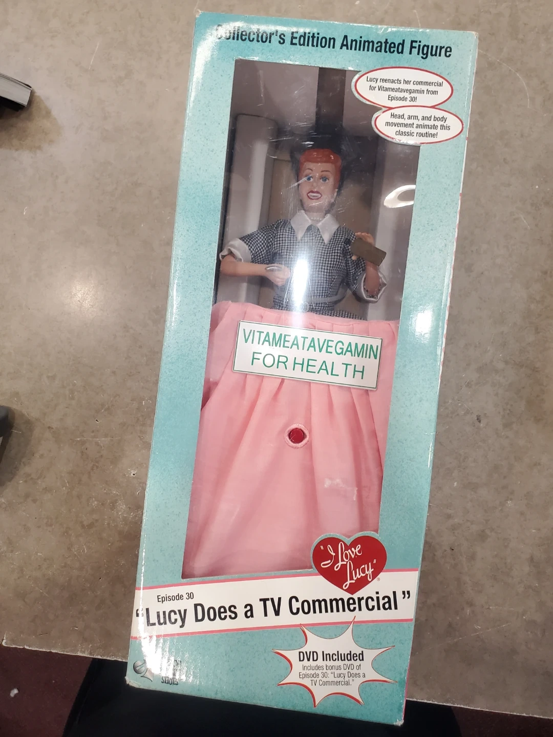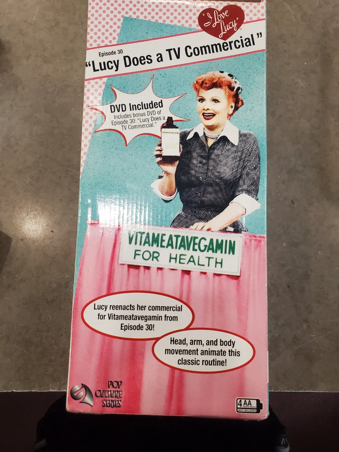 Selling an I Love Lucy "Lucy Does a TV Commercial" Collector's Edition Animated Figure! It includes a bonus DVD of Episode 30, "Lucy Does a TV Commercial". The figure features head, arm, and body movement to animate this classic routine. It's part of the Gemmy Pop Culture Series. Requires 4 AA batteries (not included).