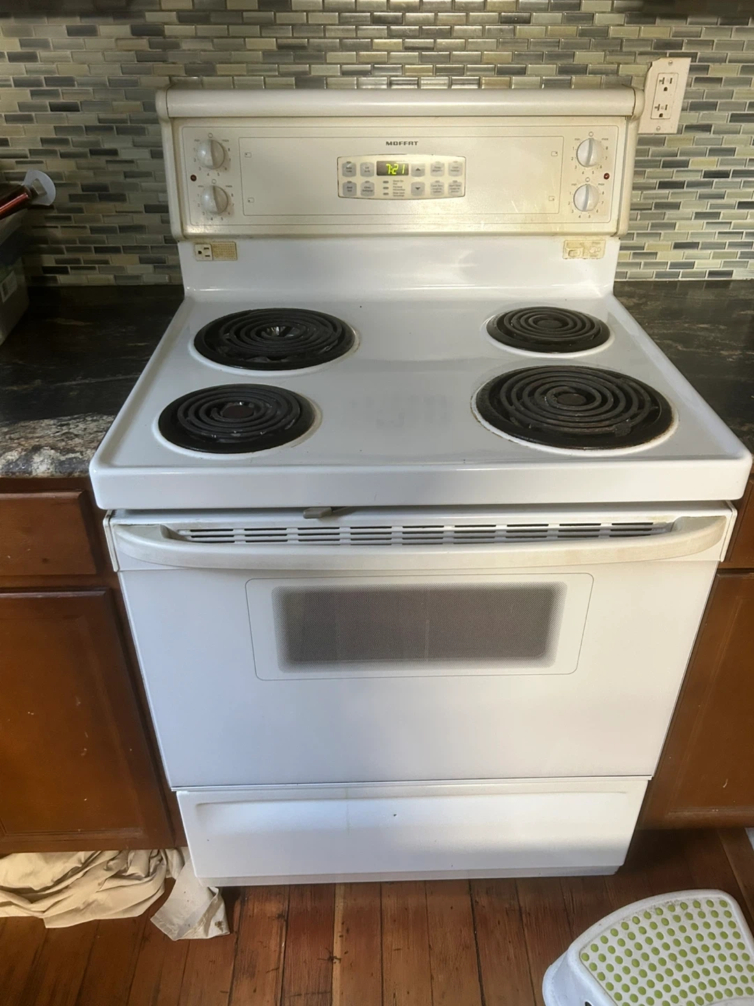 Selling a Moffat electric range stove. It's white and has four burners on top and an oven at the bottom. It shows some signs of use.