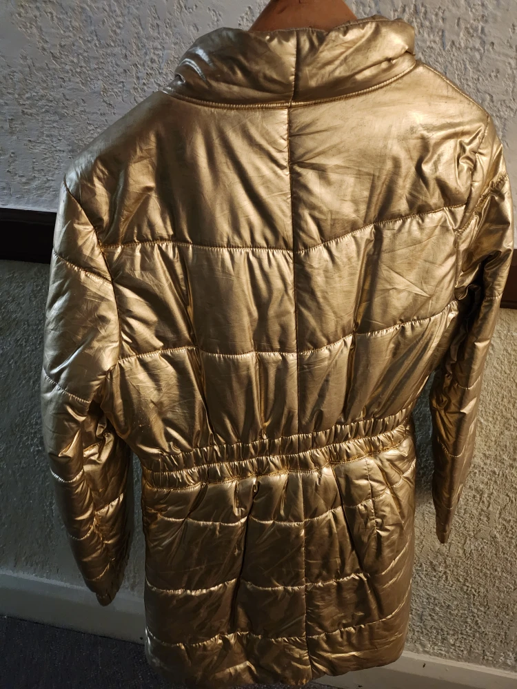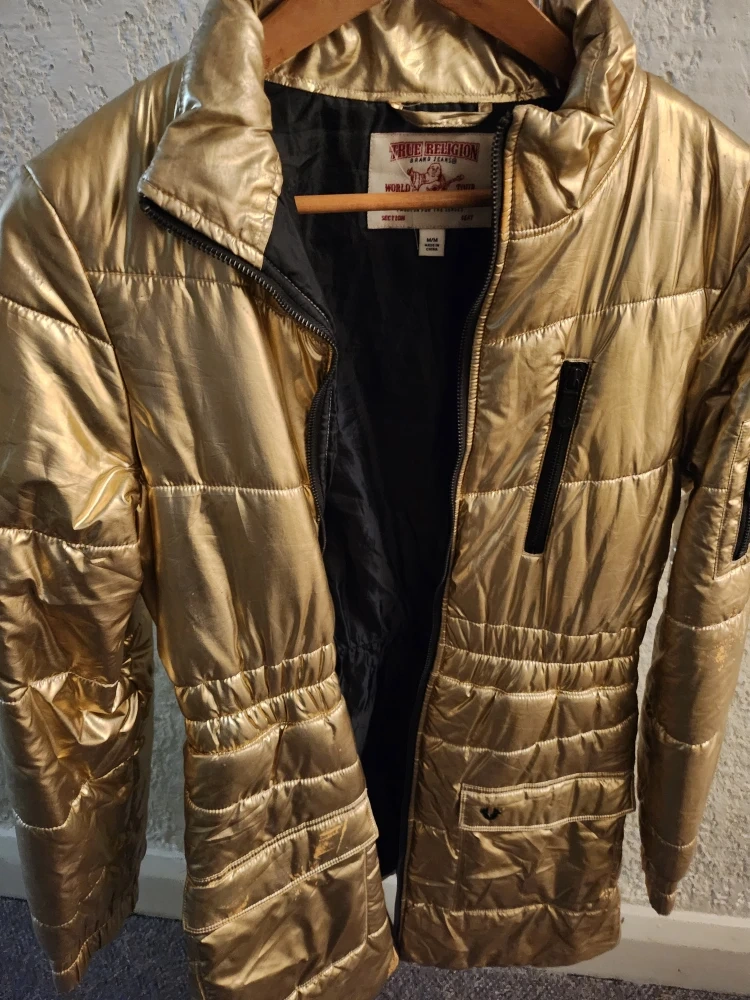 Love this Coat!!Ever worn clothing so Unique people stare at you like you're a Martian??!! This Fabulous True Religion puffer jacket is a beautiful gold colour and a size medium. Value $700. Perfect for adding a whole lot of Holiday Oomph to your wardrobe! Perfect for an Outdoors New Year's to Standout in the Cold!!π₯°π€©π