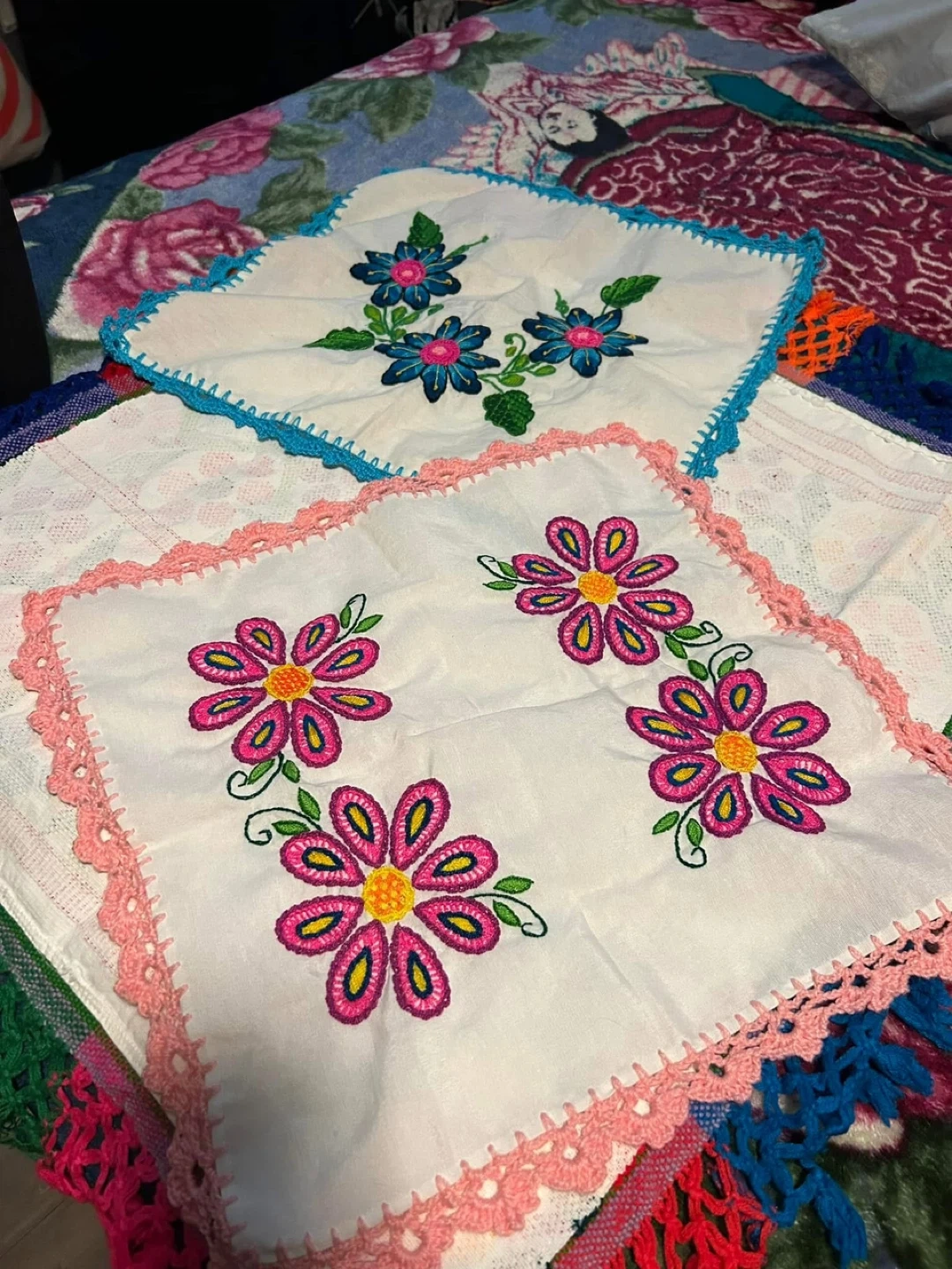 Selling handmade embroidered hankies. They are white with colorful flower designs and crocheted edges. Perfect for adding a touch of vintage charm to your collection